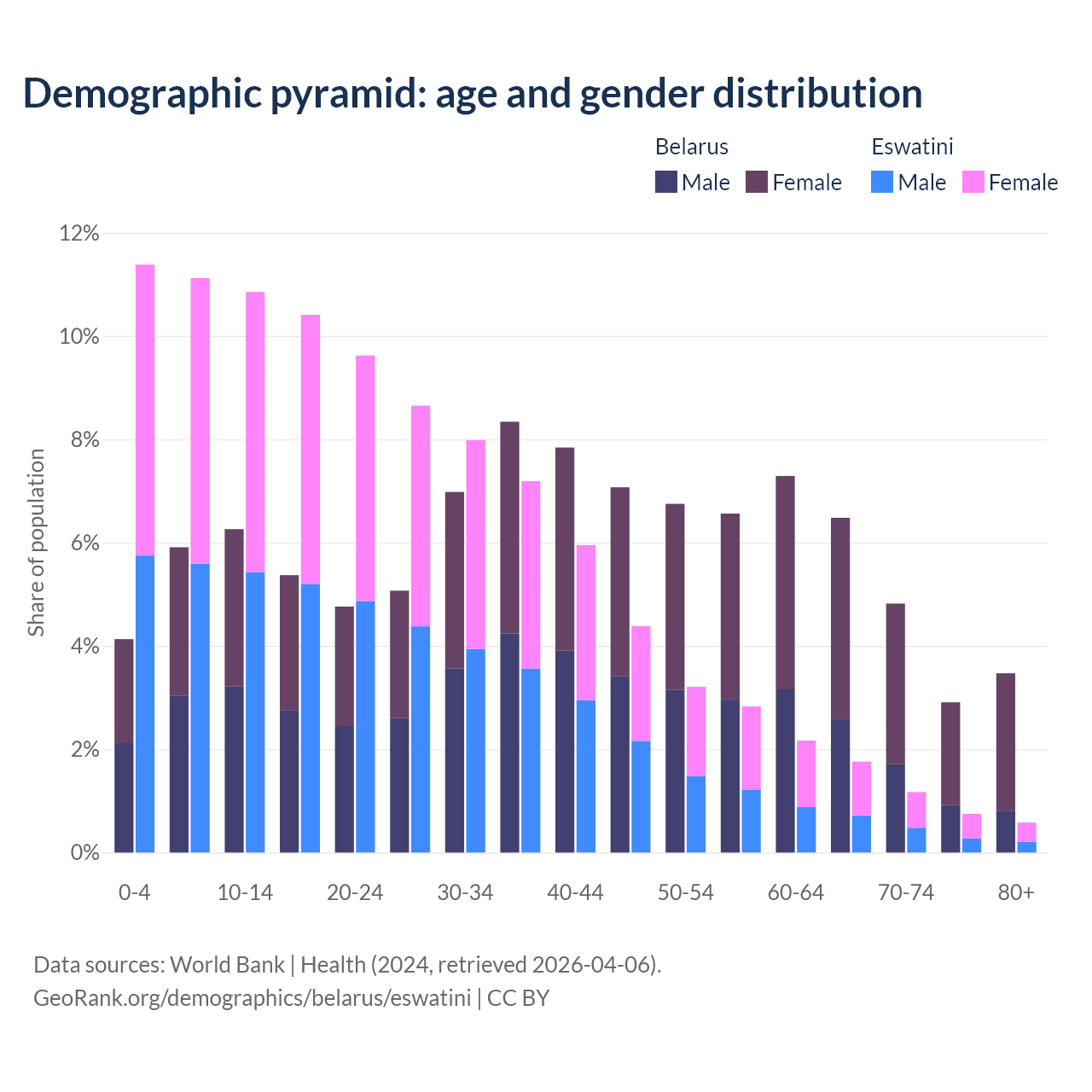 The share of older people aged 65 and over is 17.7% in Belarus and 4.26% in Eswatini. Life expectancy in Belarus compared to Eswatini .