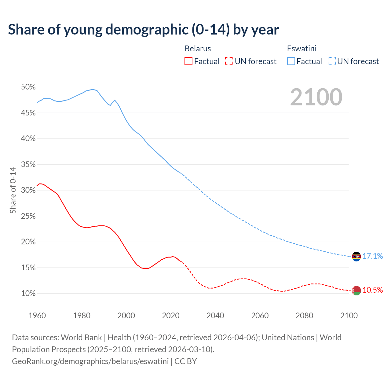 - The share of young demographic (0-15 years old) in Belarus is 16.3% vs 33.4% in Eswatini.