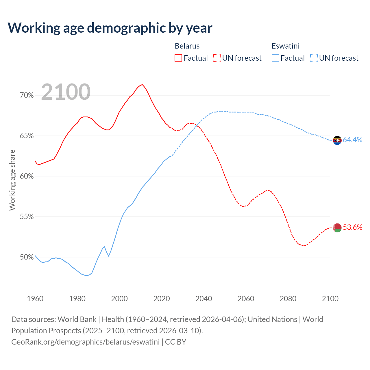 - Belarus has 5.95M working age adults (aged 15-64) vs 794K in Eswatini.
