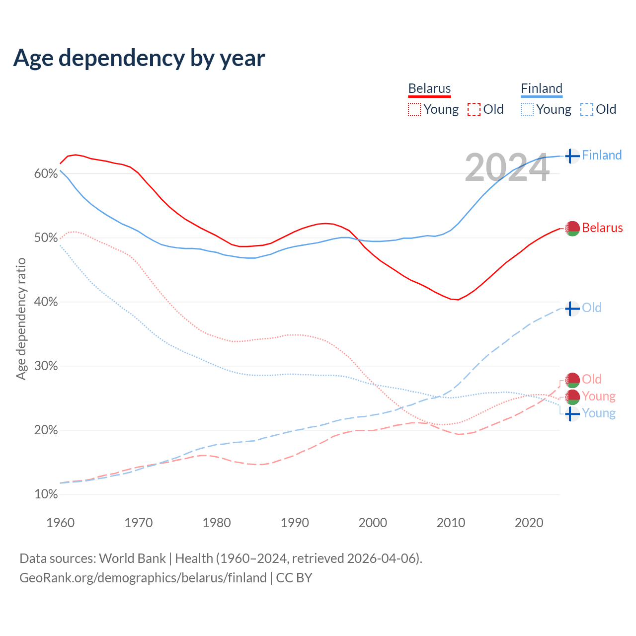 The share of older people aged 65 and over is 17.7% in Belarus and 23.9% in Finland. Life expectancy in Belarus compared to Finland .