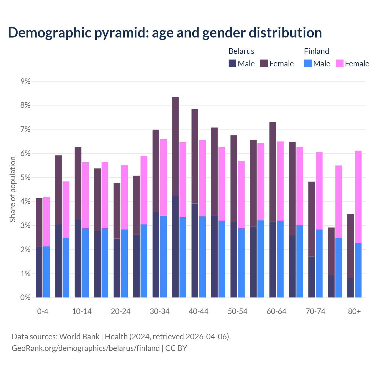 - As of 2026, the population of Belarus is 9.01M vs 5.63M in Finland - 1.6 times difference.