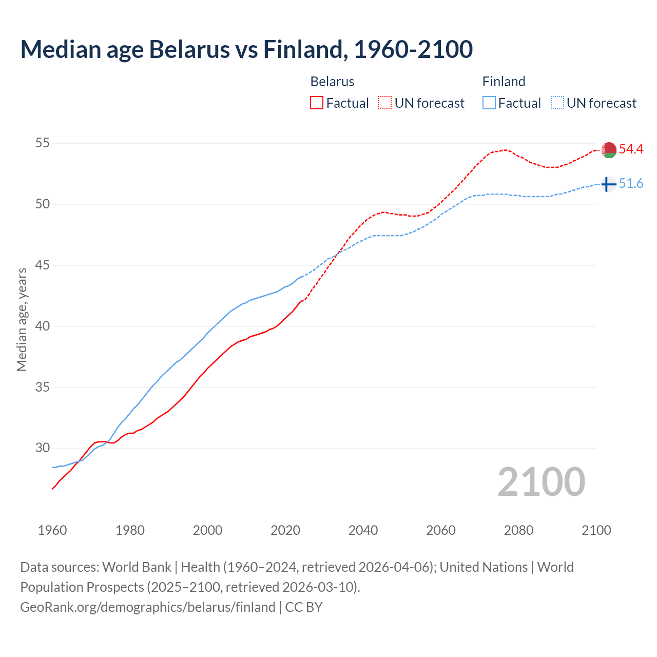 - Belarus is ranked 35/196 by median age (oldest to youngest) vs 22/196 for Finland.
