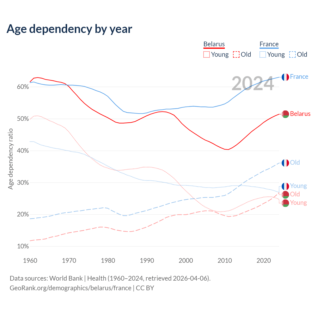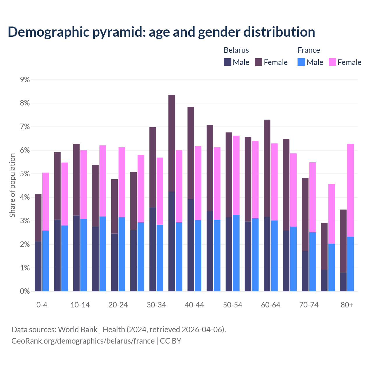 - Belarus is ranked 35/196 by median age (oldest to youngest) vs 29/196 for France.