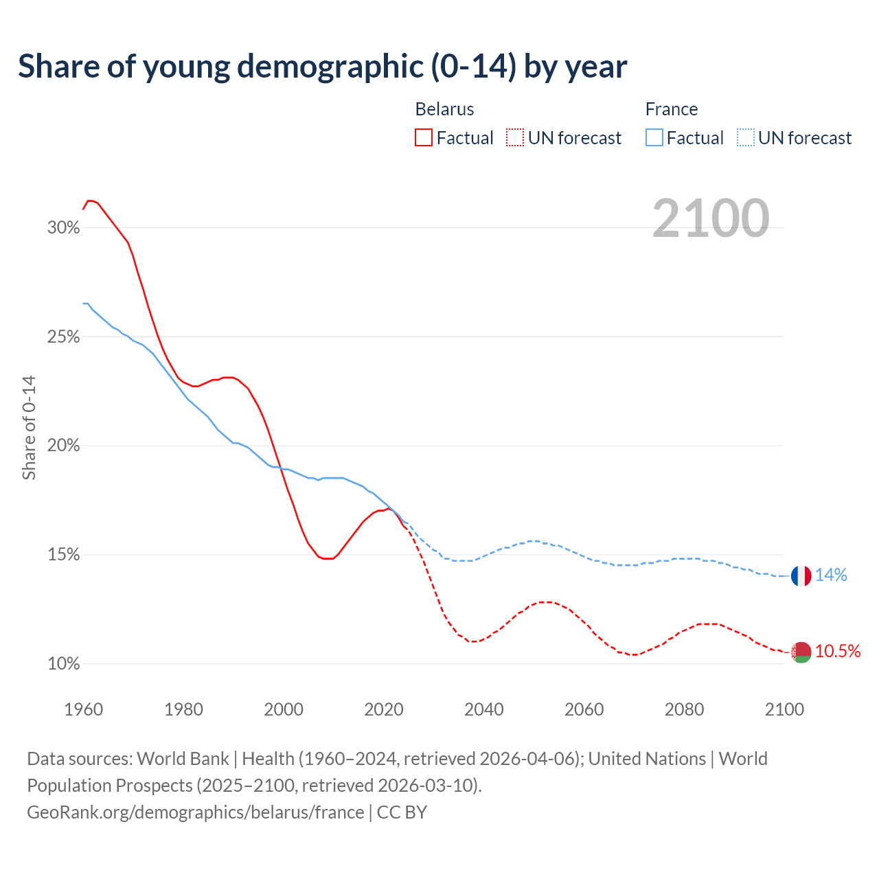 - The share of young demographic (0-15 years old) in Belarus is 16.3% vs 16.5% in France.