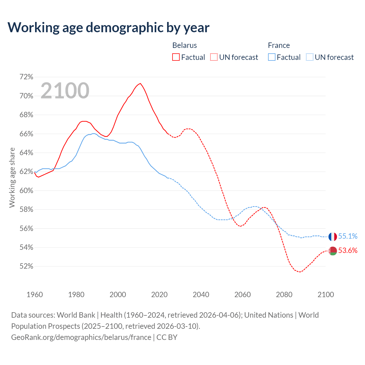 - Belarus has 5.95M working age adults (aged 15-64) vs 42.2M in France.