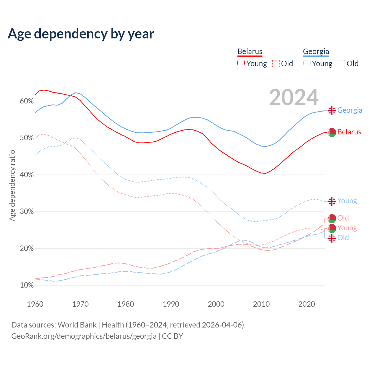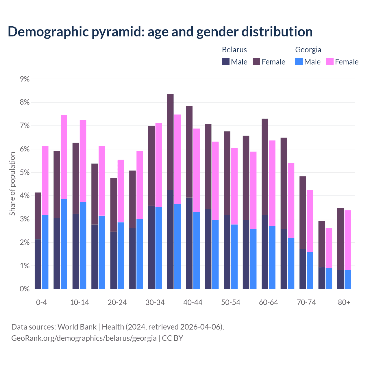 - Belarus is ranked 35/196 by median age (oldest to youngest) vs 59/196 for Georgia.