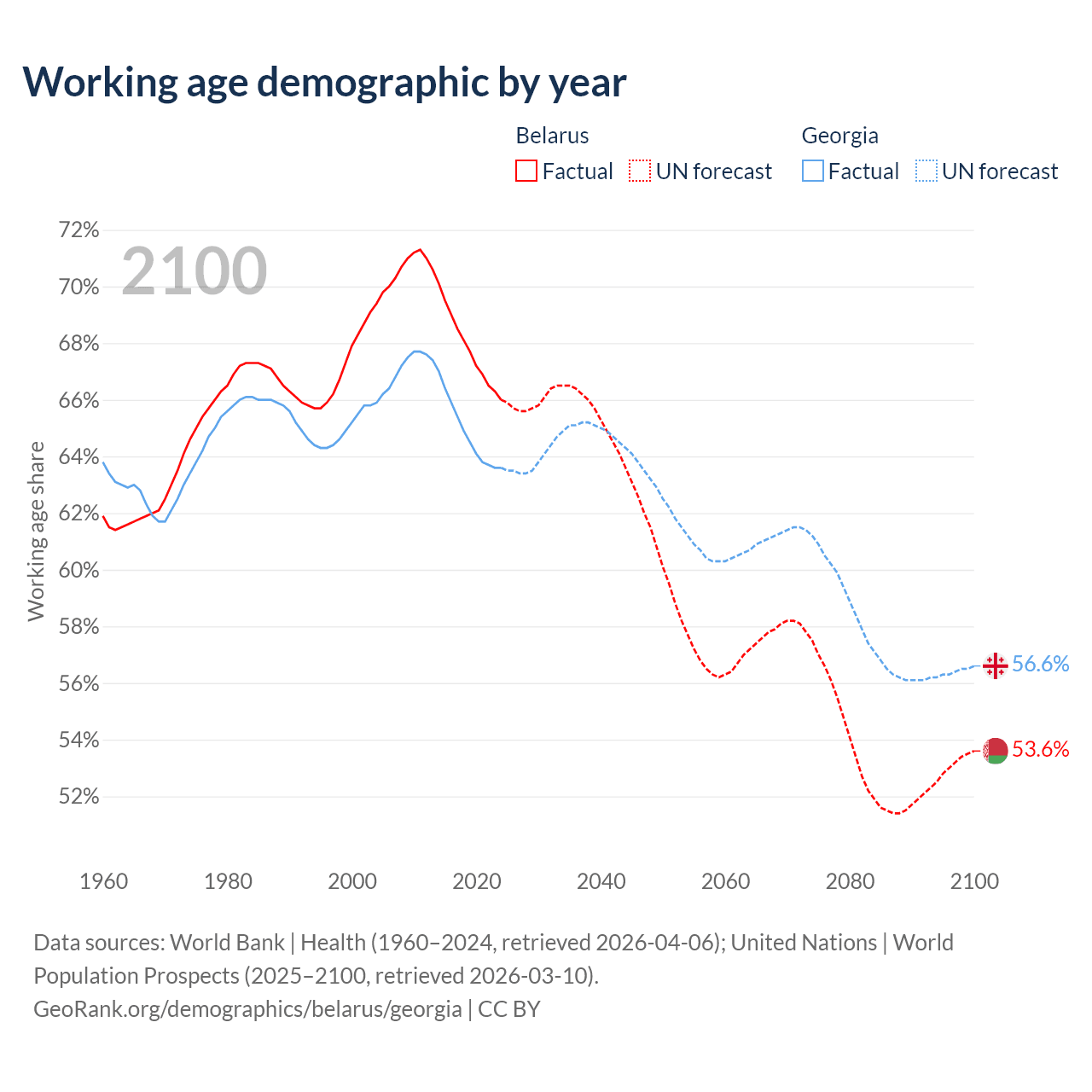 - Belarus has 5.95M working age adults (aged 15-64) vs 2.35M in Georgia.