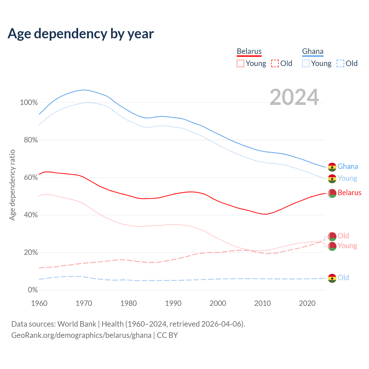 The share of older people aged 65 and over is 17.7% in Belarus and 3.71% in Ghana. Life expectancy in Belarus compared to Ghana .