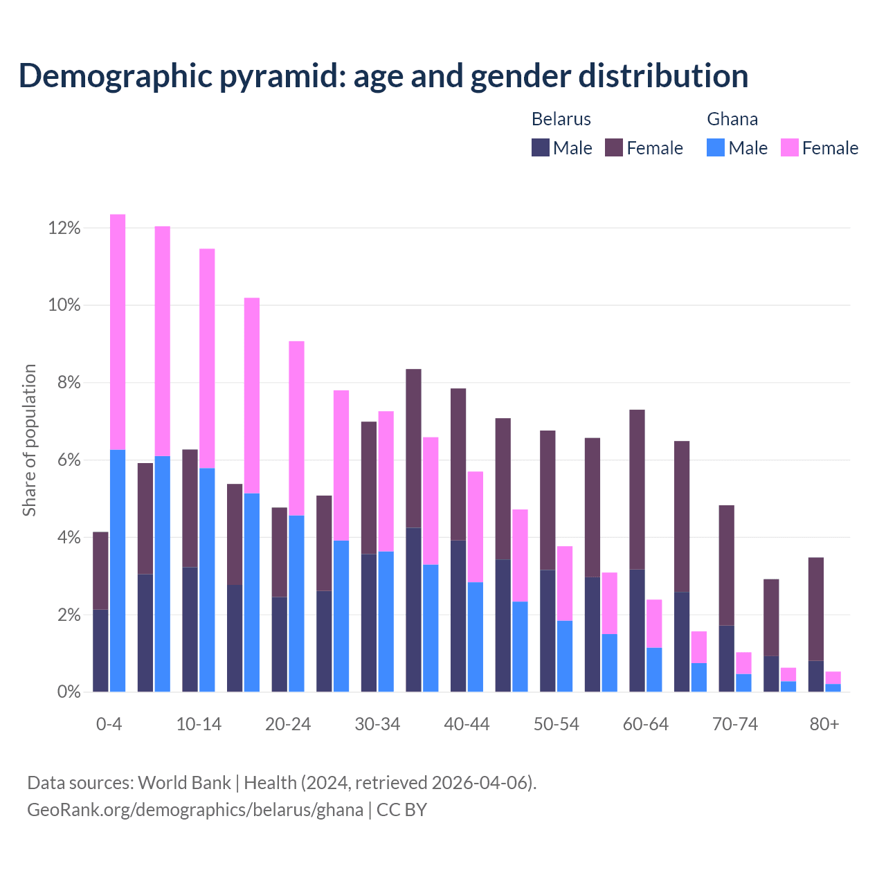 - Belarus is ranked 35/196 by median age (oldest to youngest) vs 146/196 for Ghana.