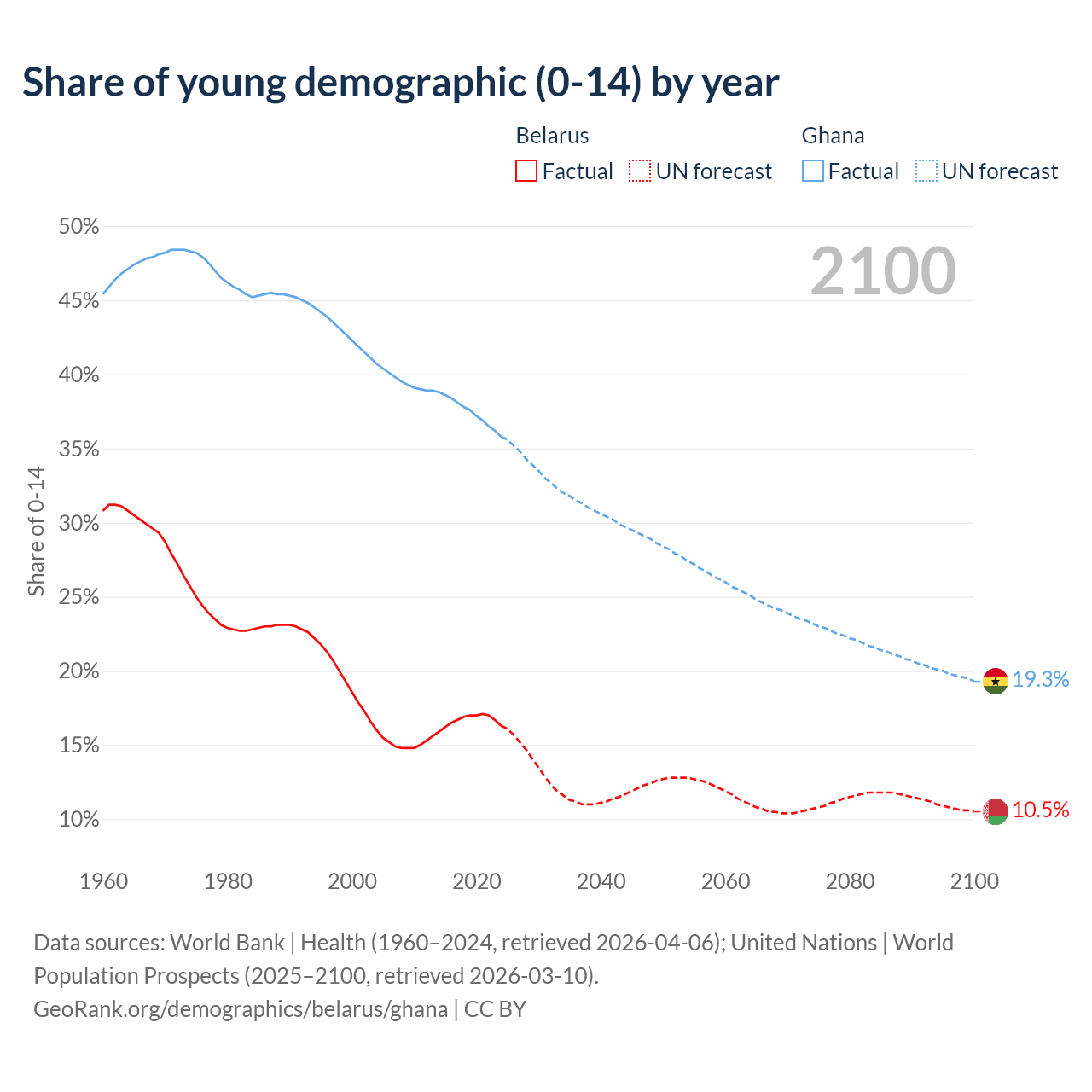 - The share of young demographic (0-15 years old) in Belarus is 16.3% vs 35.8% in Ghana.