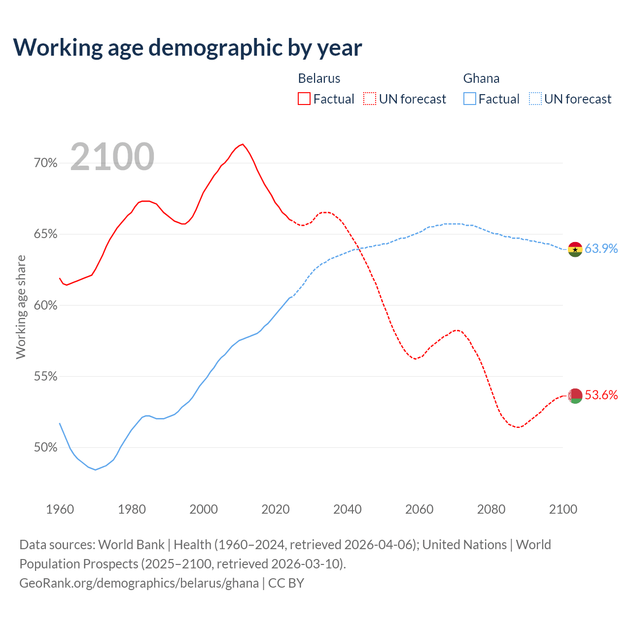 - Belarus has 5.95M working age adults (aged 15-64) vs 21.7M in Ghana.