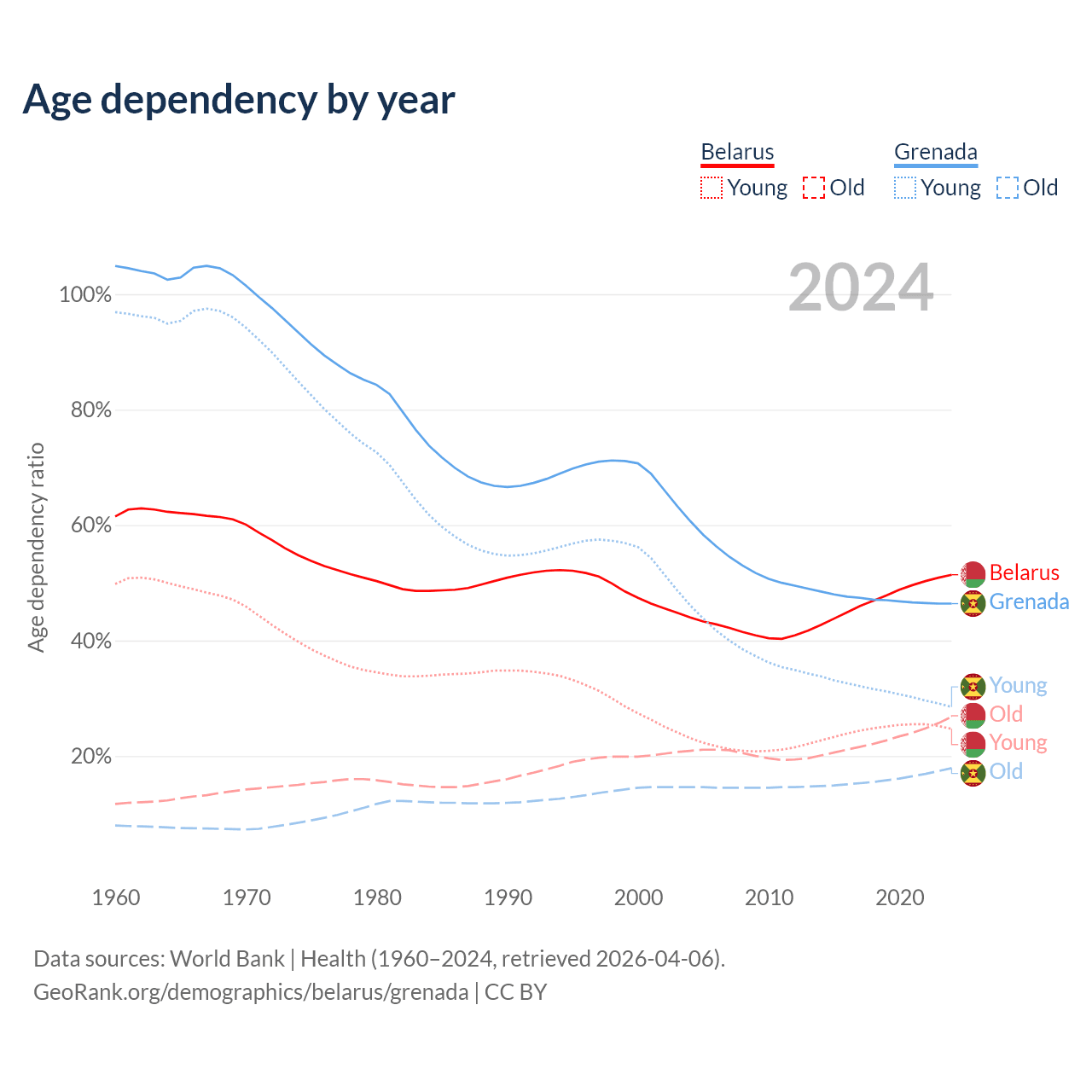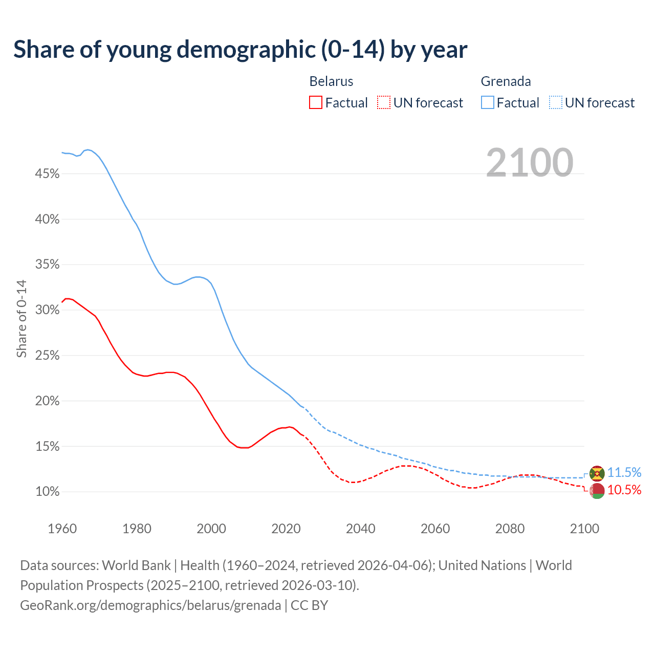 - The share of young demographic (0-15 years old) in Belarus is 16.3% vs 19.4% in Grenada.