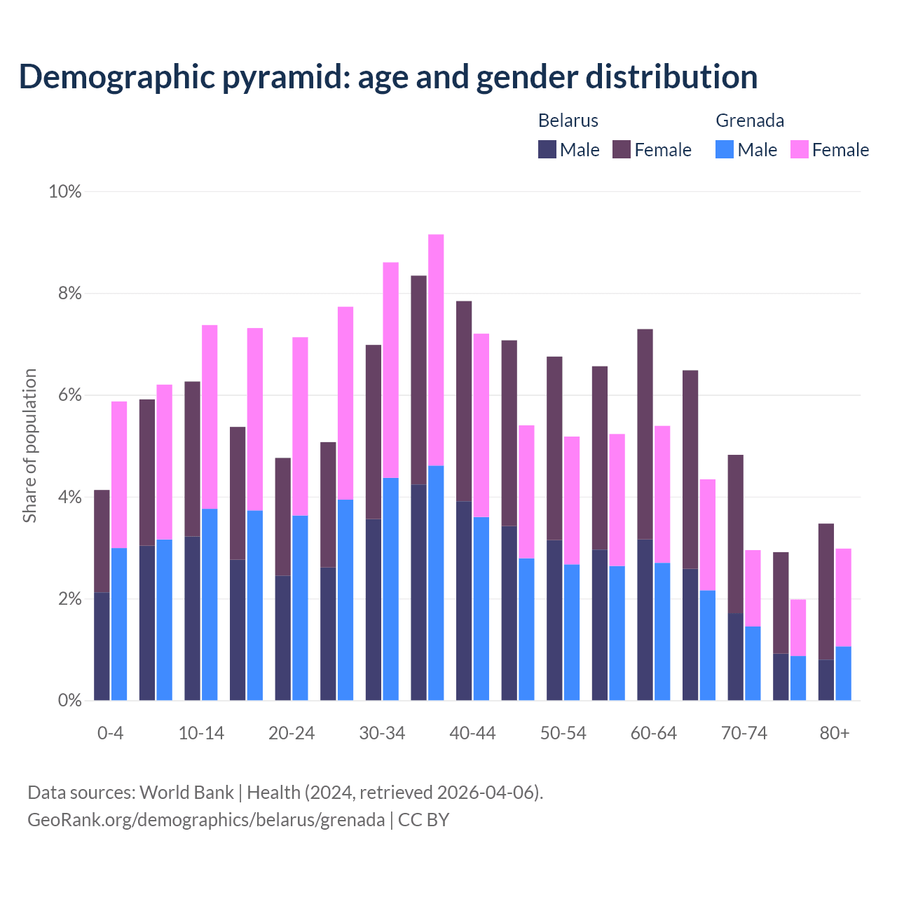 - Belarus is ranked 35/196 by median age (oldest to youngest) vs 77/196 for Grenada.