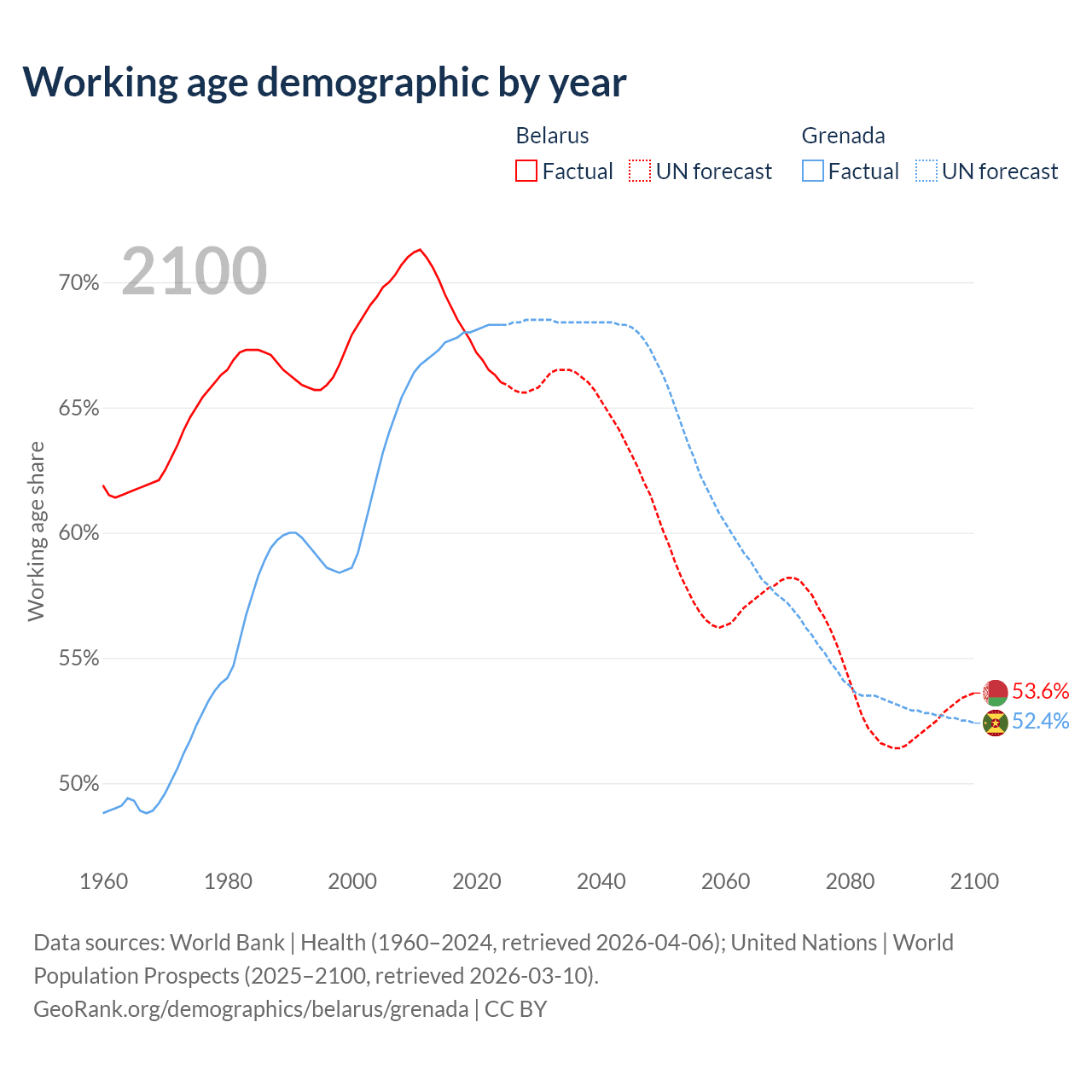- Belarus has 5.95M working age adults (aged 15-64) vs 80.2K in Grenada.