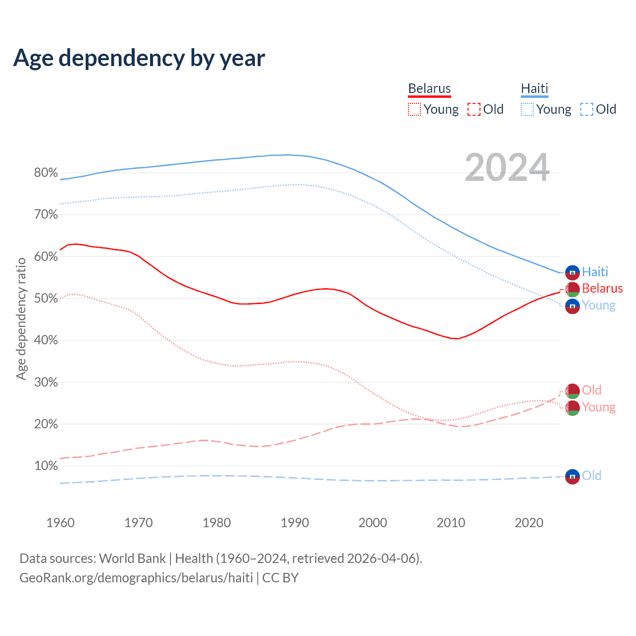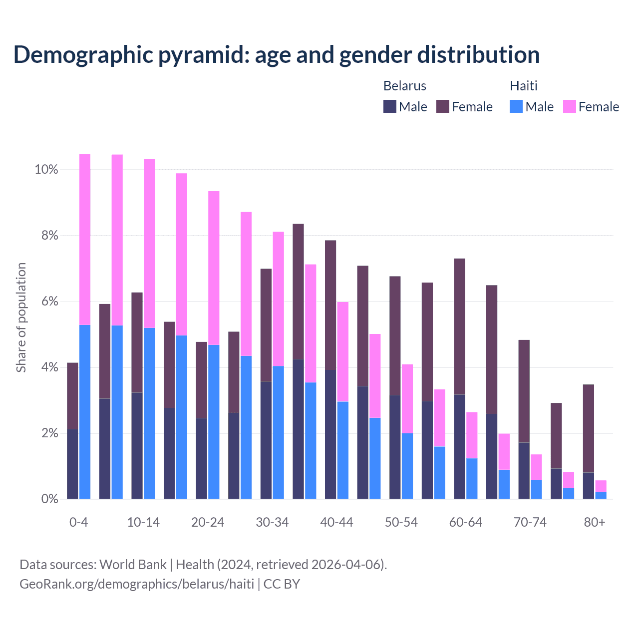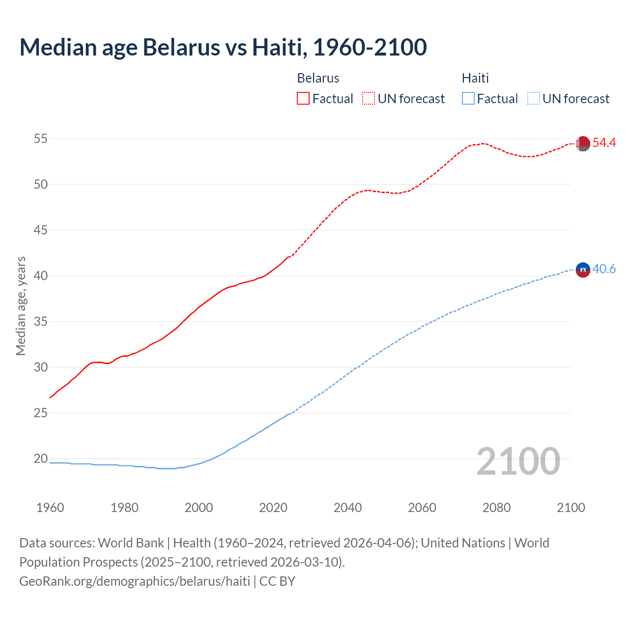 - Belarus is ranked 35/196 by median age (oldest to youngest) vs 135/196 for Haiti.