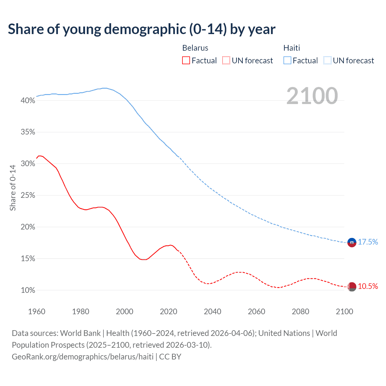 - The share of young demographic (0-15 years old) in Belarus is 16.3% vs 31.2% in Haiti.