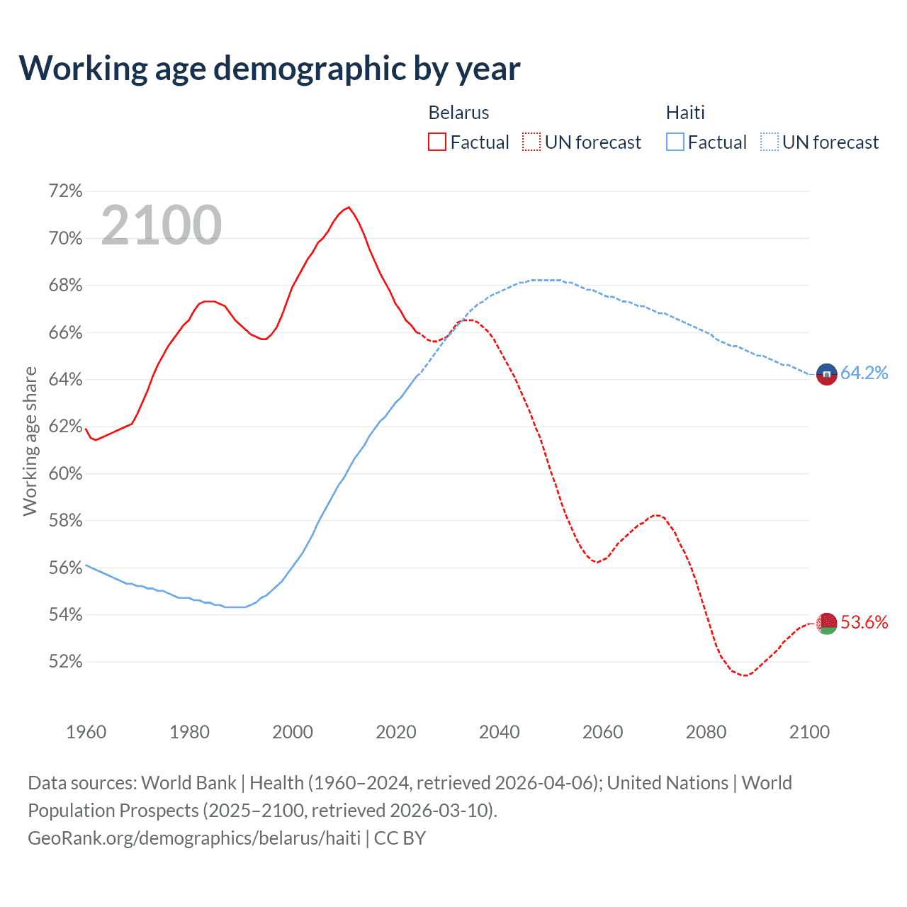 - Belarus has 5.95M working age adults (aged 15-64) vs 7.74M in Haiti.