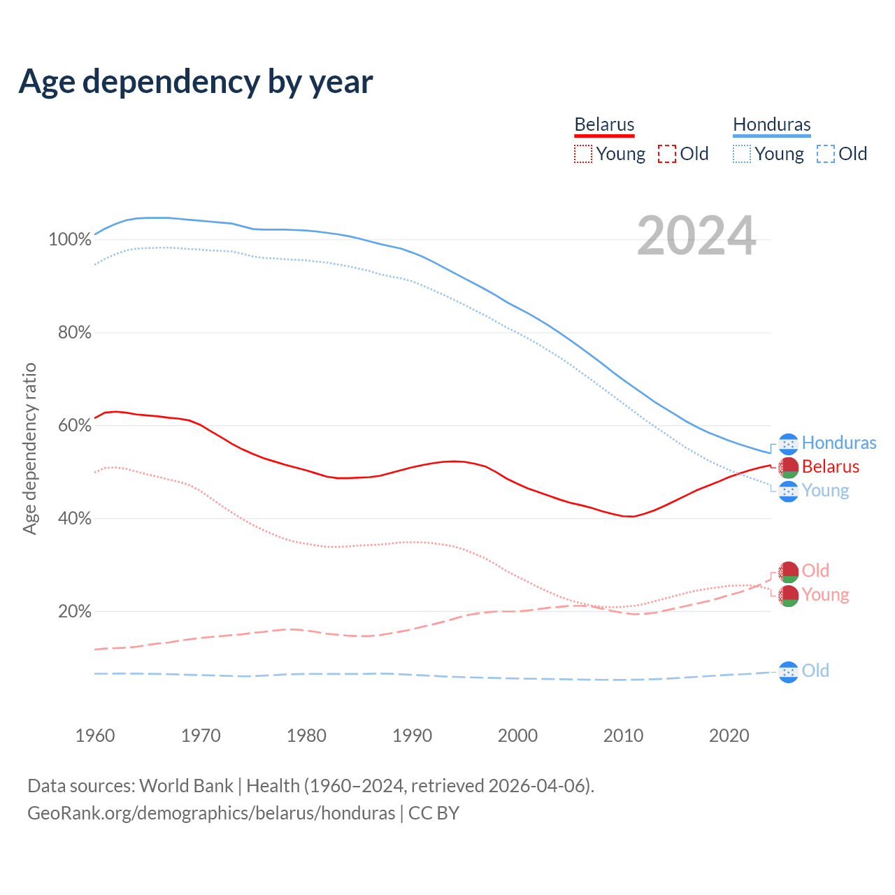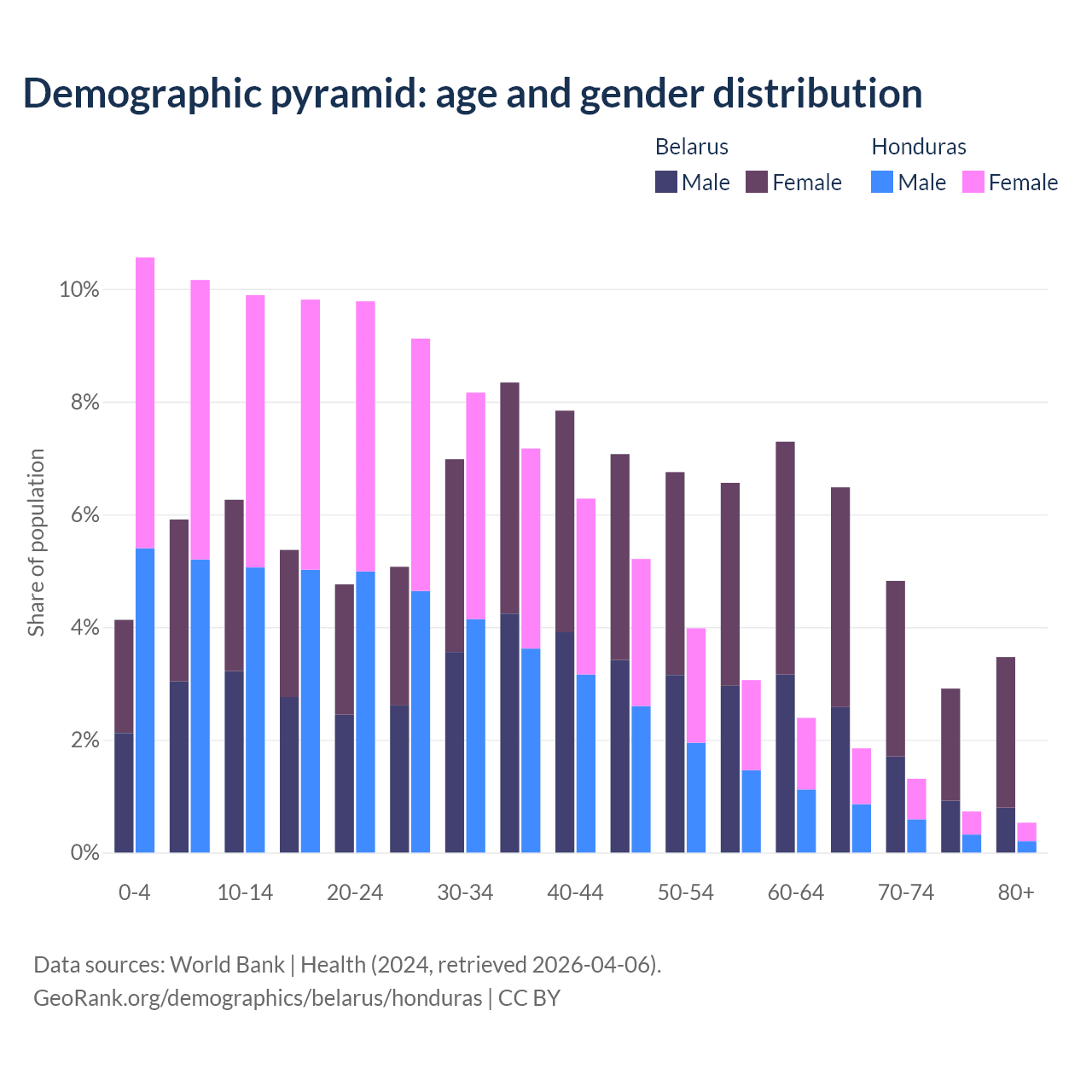 - Belarus is ranked 35/196 by median age (oldest to youngest) vs 134/196 for Honduras.