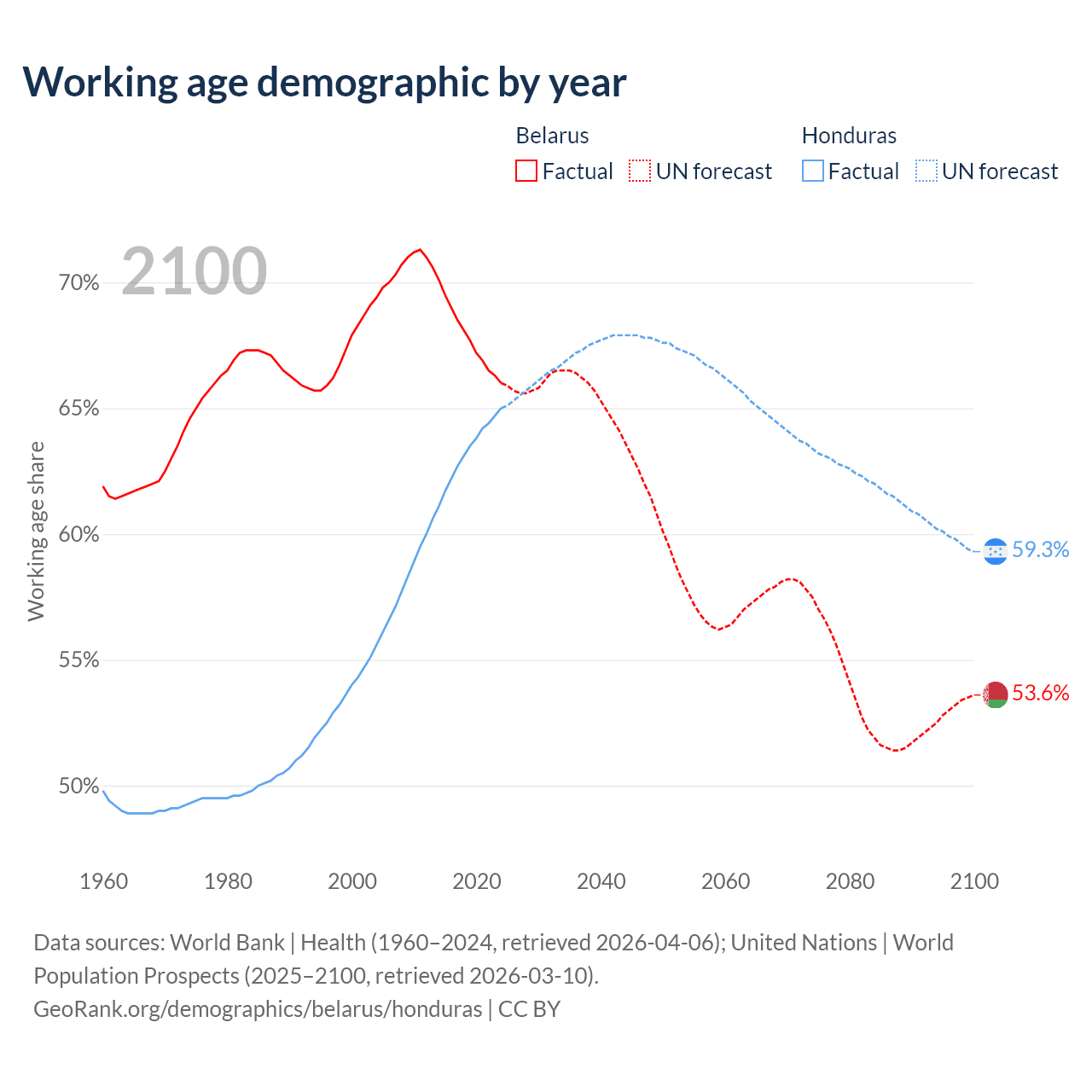 - Belarus has 5.95M working age adults (aged 15-64) vs 7.3M in Honduras.