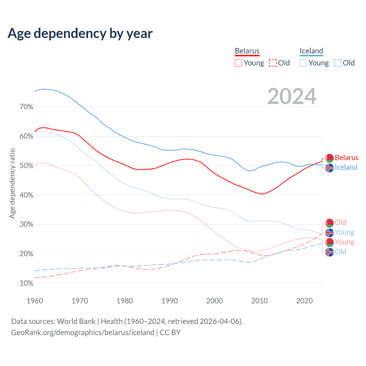 - Belarus is ranked 35/196 by median age (oldest to youngest) vs 65/196 for Iceland.