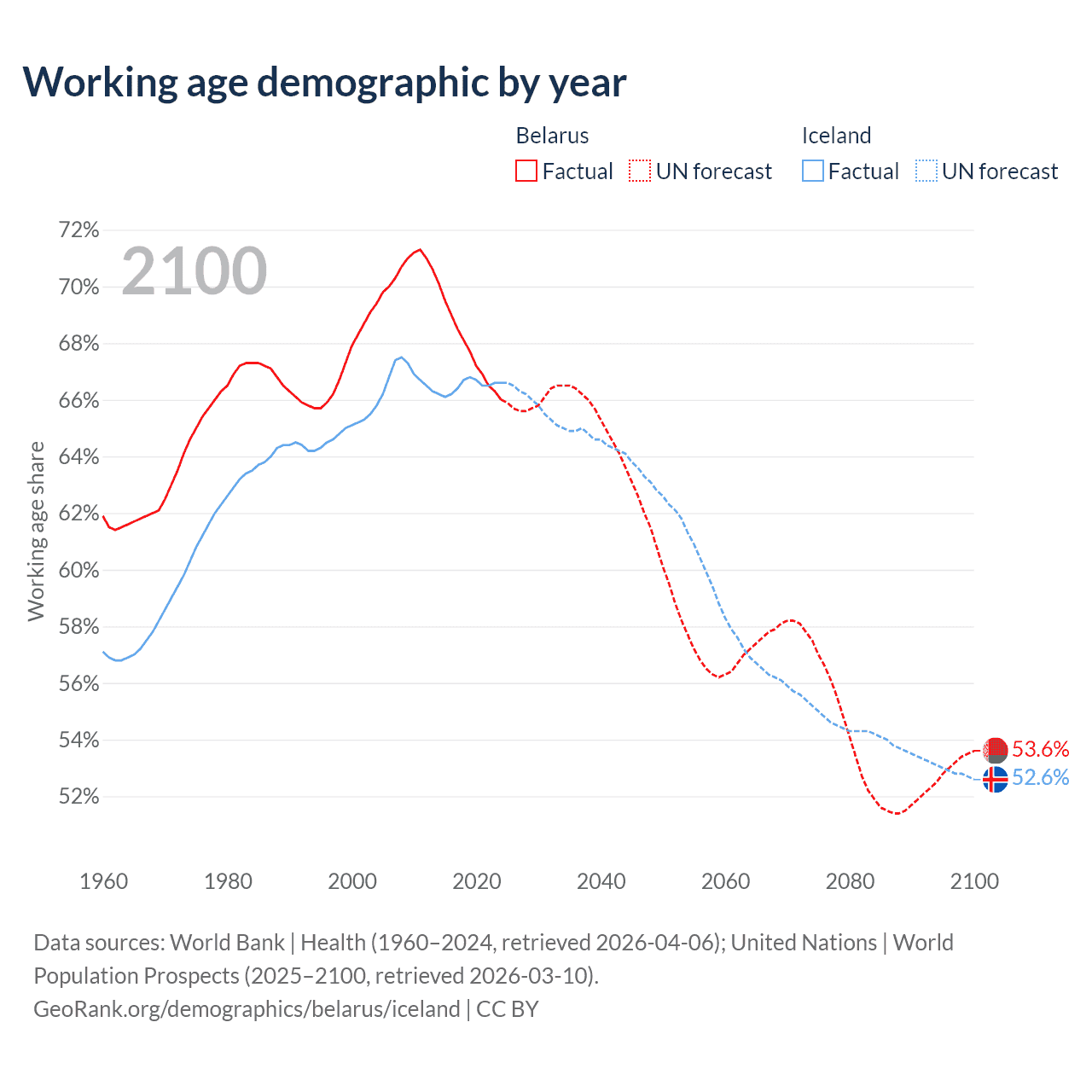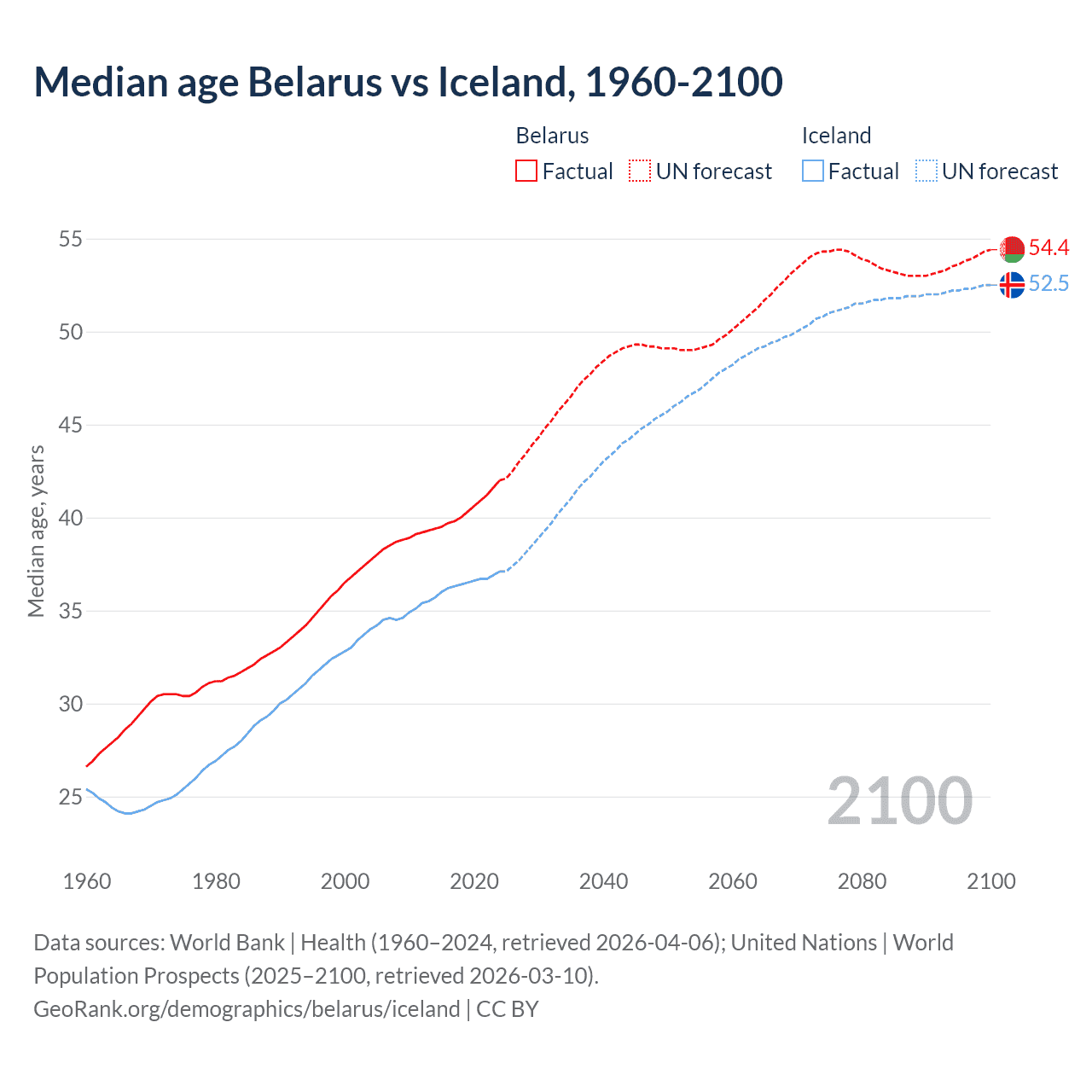 Median age Belarus vs Iceland, 1960-2100