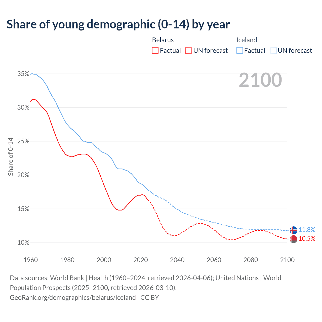- The share of young demographic (0-15 years old) in Belarus is 16.3% vs 17.8% in Iceland.