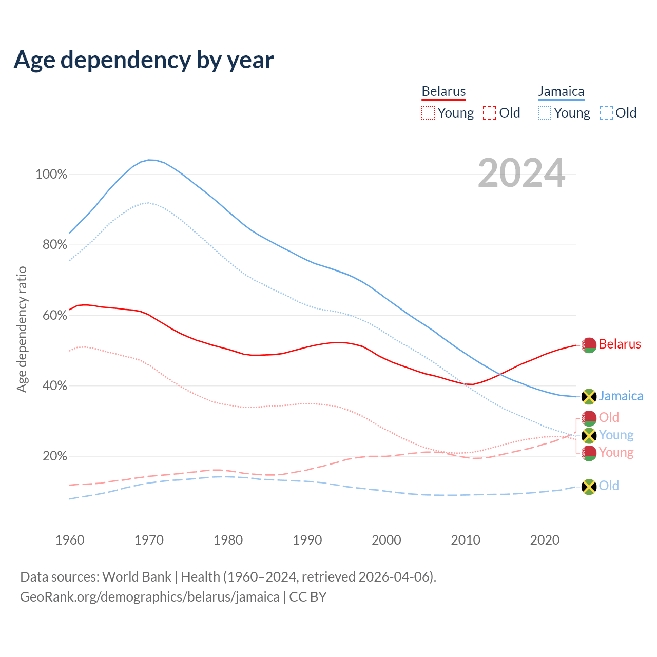 - The share of old-age demographic (65+) in Belarus is 17.7% vs 8.21% in Jamaica.