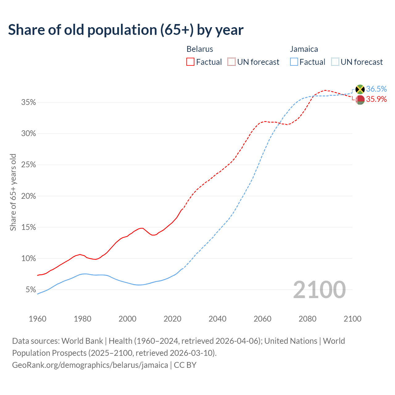 The share of older people aged 65 and over is 17.7% in Belarus and 8.21% in Jamaica. Life expectancy in Belarus compared to Jamaica .