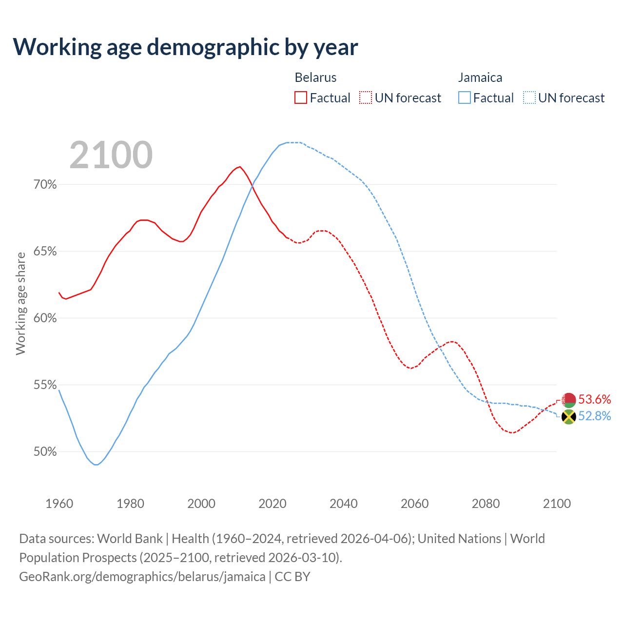 - Belarus has 5.95M working age adults (aged 15-64) vs 2.07M in Jamaica.
