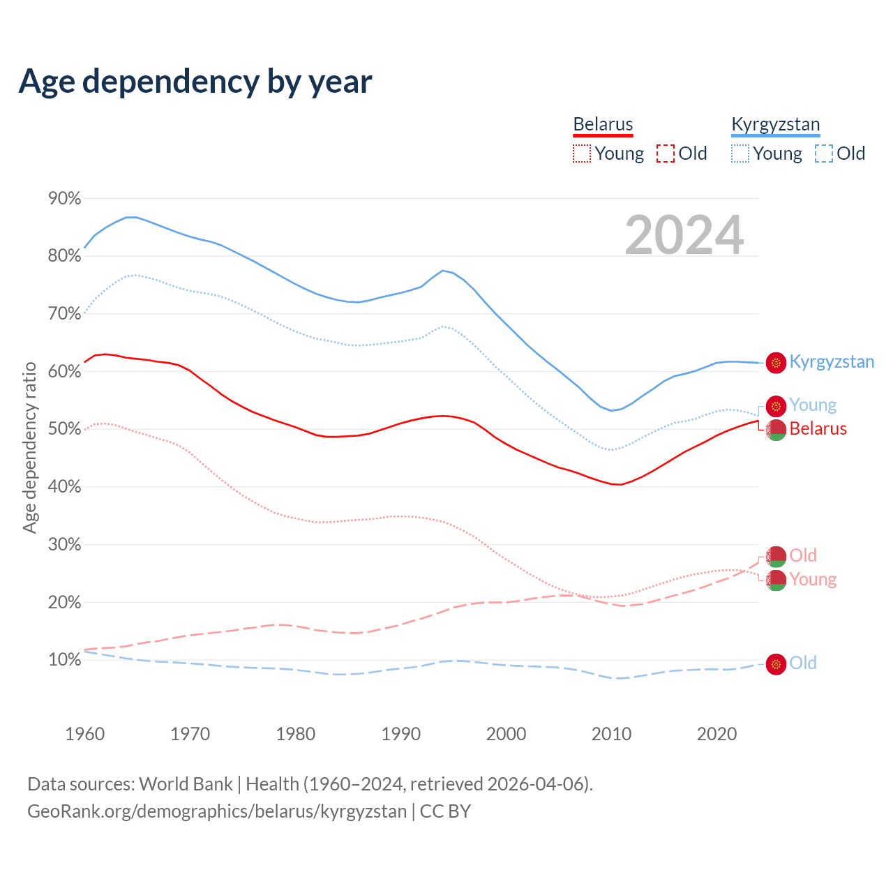 - The share of old-age demographic (65+) in Belarus is 17.7% vs 5.68% in Kyrgyzstan.