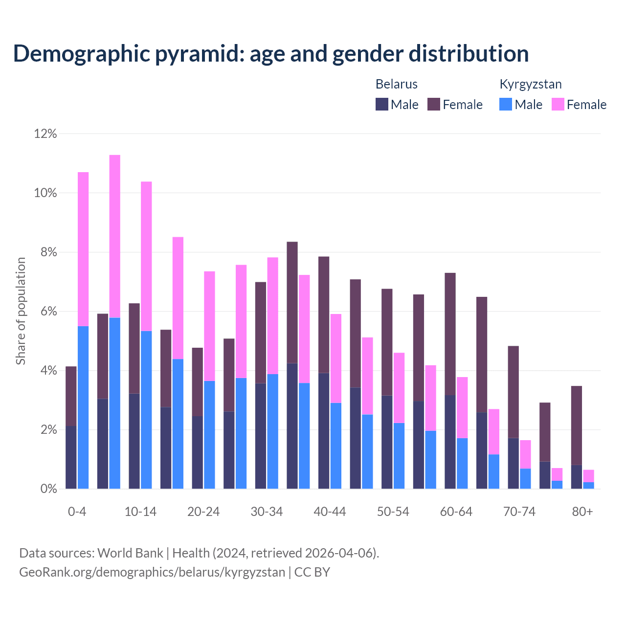 - Belarus is ranked 35/196 by median age (oldest to youngest) vs 126/196 for Kyrgyzstan.