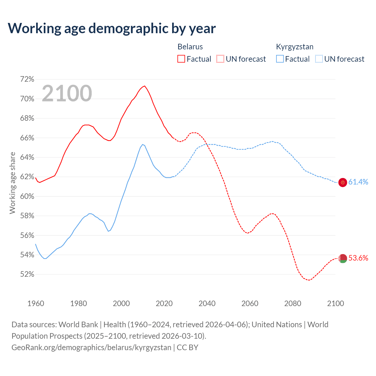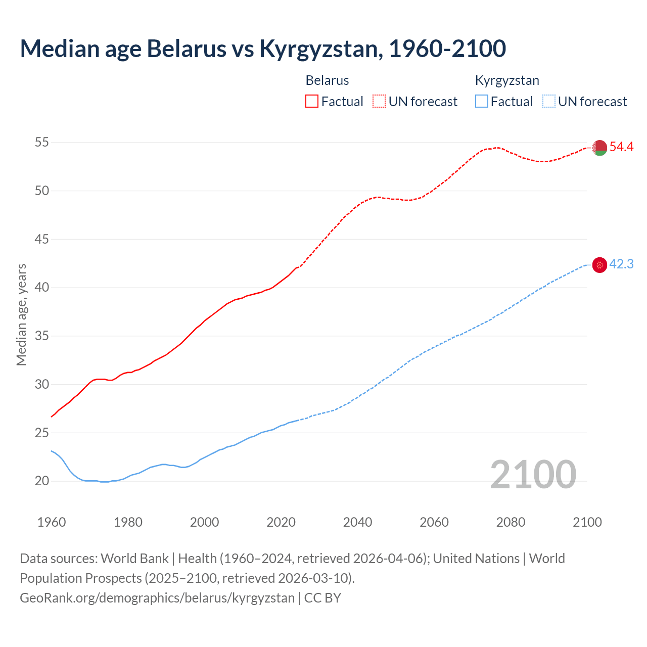 Median age Belarus vs Kyrgyzstan, 1960-2100
