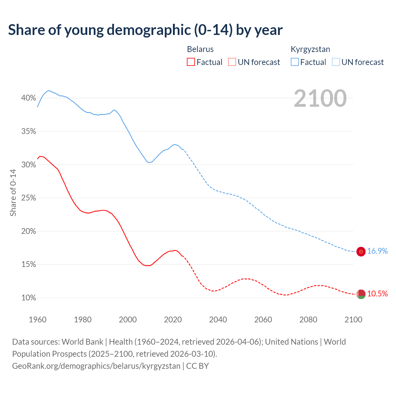 - The share of young demographic (0-15 years old) in Belarus is 16.3% vs 32.3% in Kyrgyzstan.