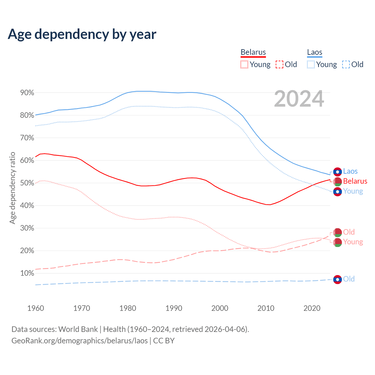 - The share of old-age demographic (65+) in Belarus is 17.7% vs 4.67% in Laos.
