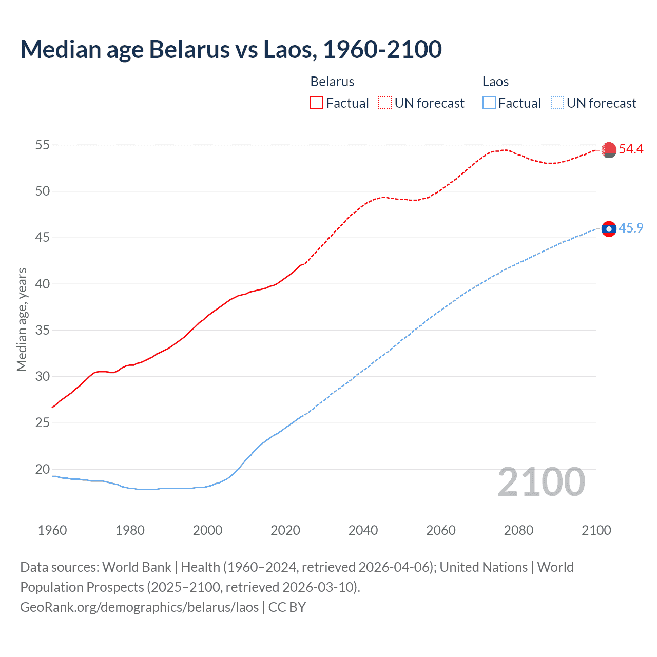 Median age Belarus vs Laos, 1960-2100