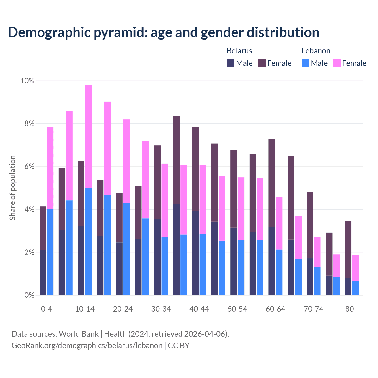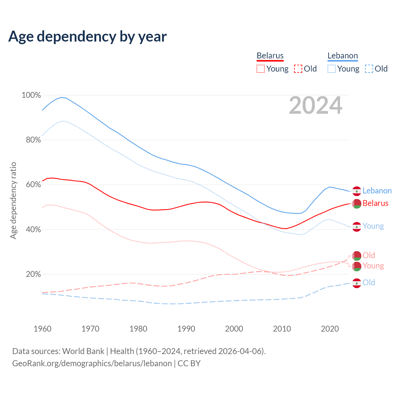 - Belarus is ranked 35/196 by median age (oldest to youngest) vs 106/196 for Lebanon.