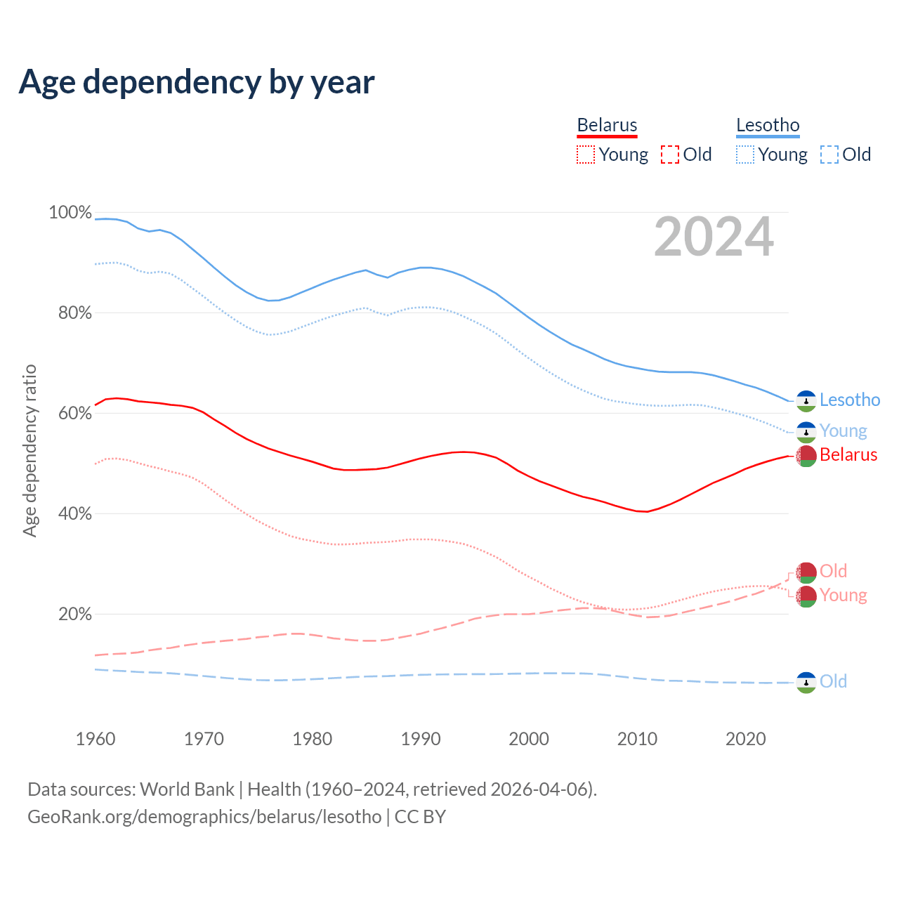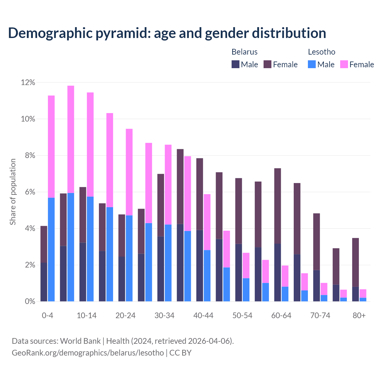 - Belarus is ranked 35/196 by median age (oldest to youngest) vs 143/196 for Lesotho.