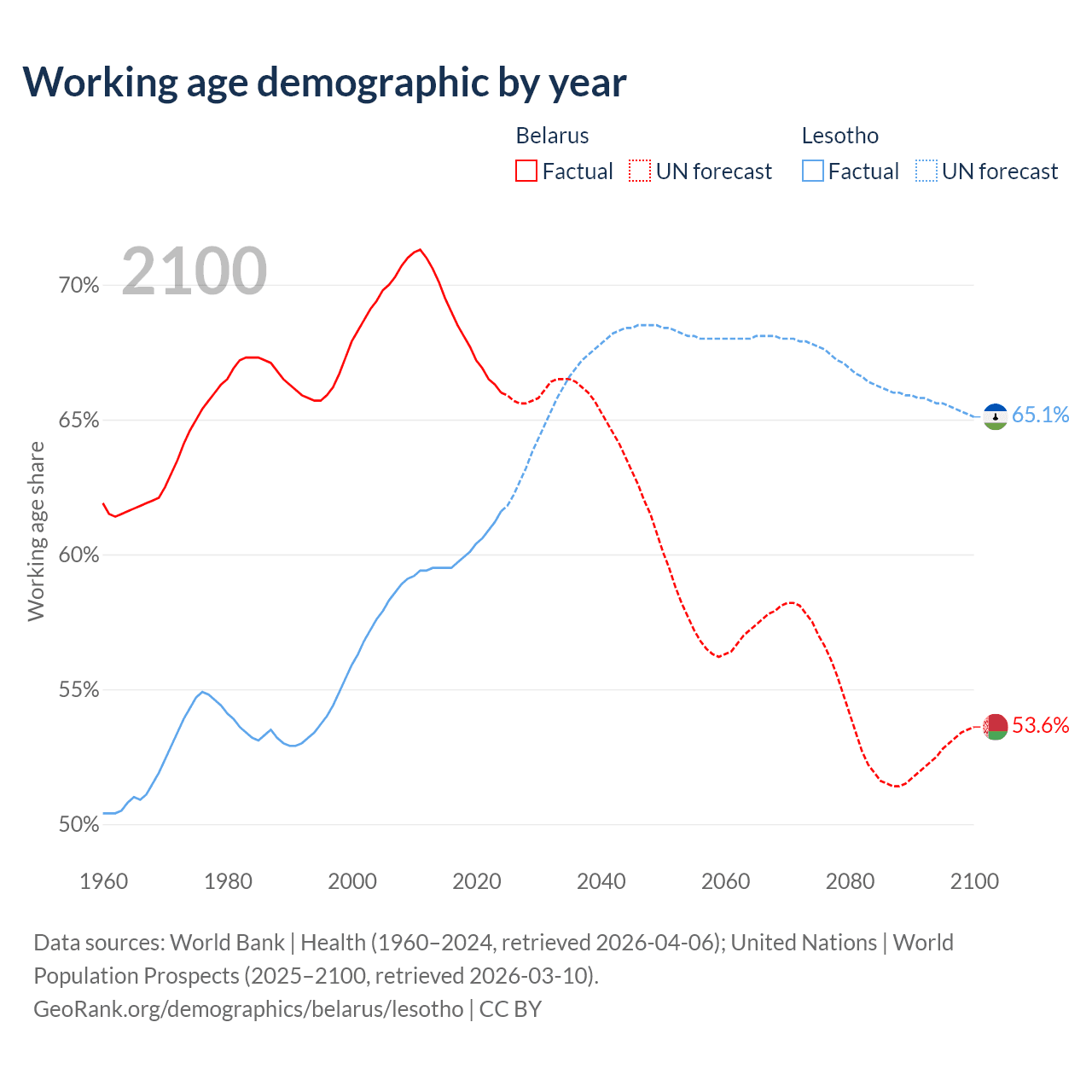 - Belarus has 5.95M working age adults (aged 15-64) vs 1.48M in Lesotho.
