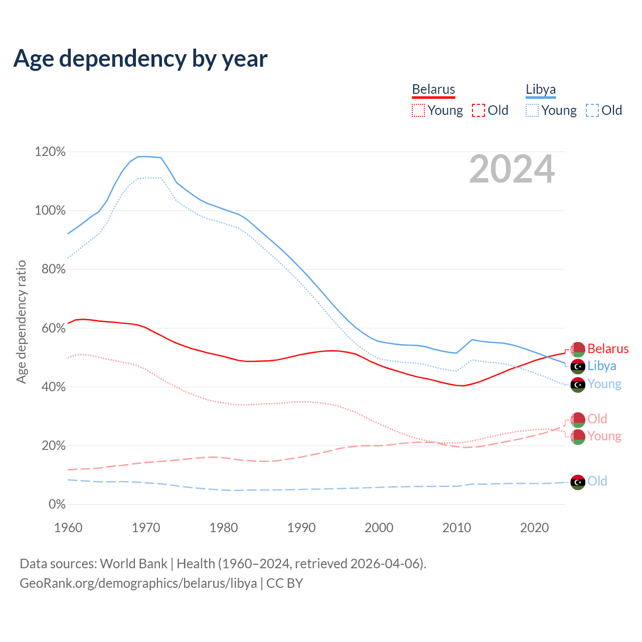 The share of older people aged 65 and over is 17.7% in Belarus and 5.02% in Libya. Life expectancy in Belarus compared to Libya .