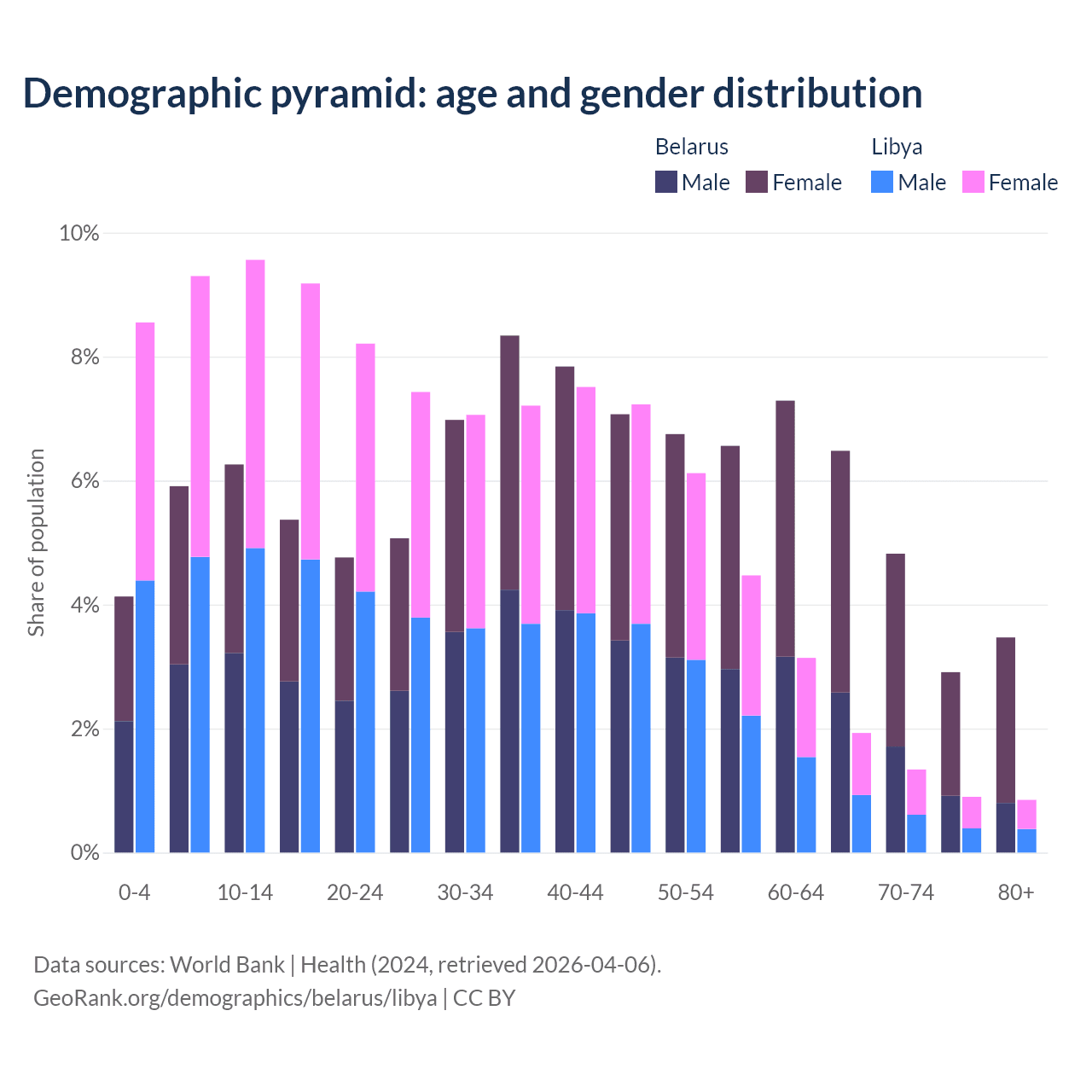 - Belarus is ranked 35/196 by median age (oldest to youngest) vs 114/196 for Libya.