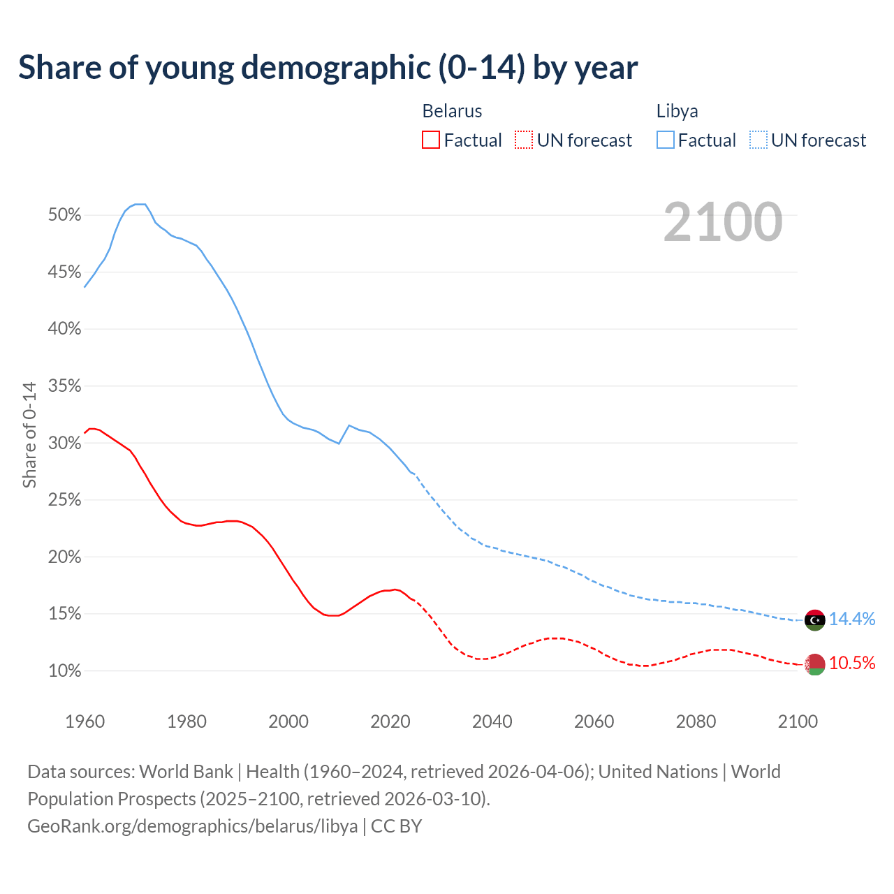 - The share of young demographic (0-15 years old) in Belarus is 16.3% vs 27.4% in Libya.