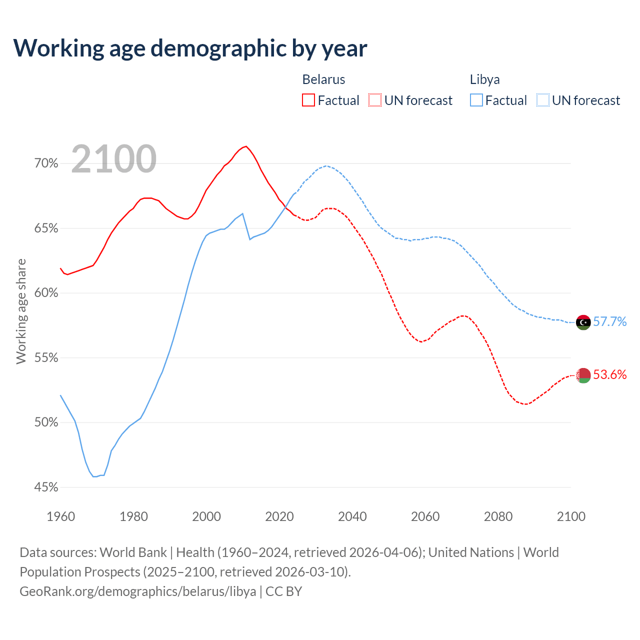 - Belarus has 5.95M working age adults (aged 15-64) vs 5.11M in Libya.