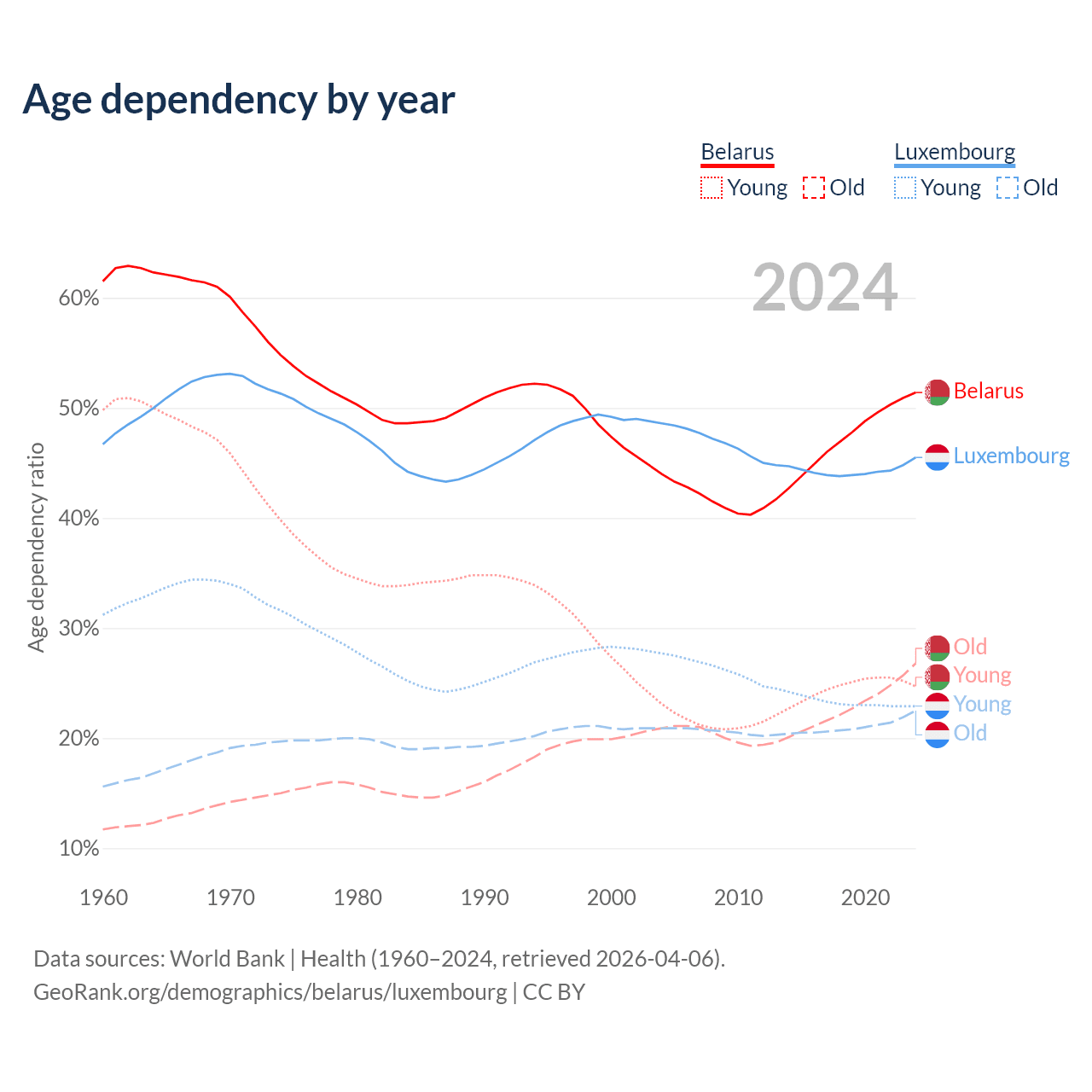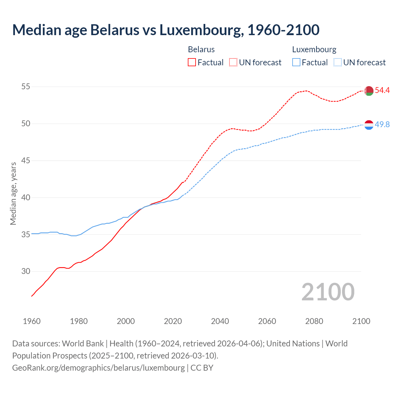 - Belarus is ranked 35/196 by median age (oldest to youngest) vs 46/196 for Luxembourg.