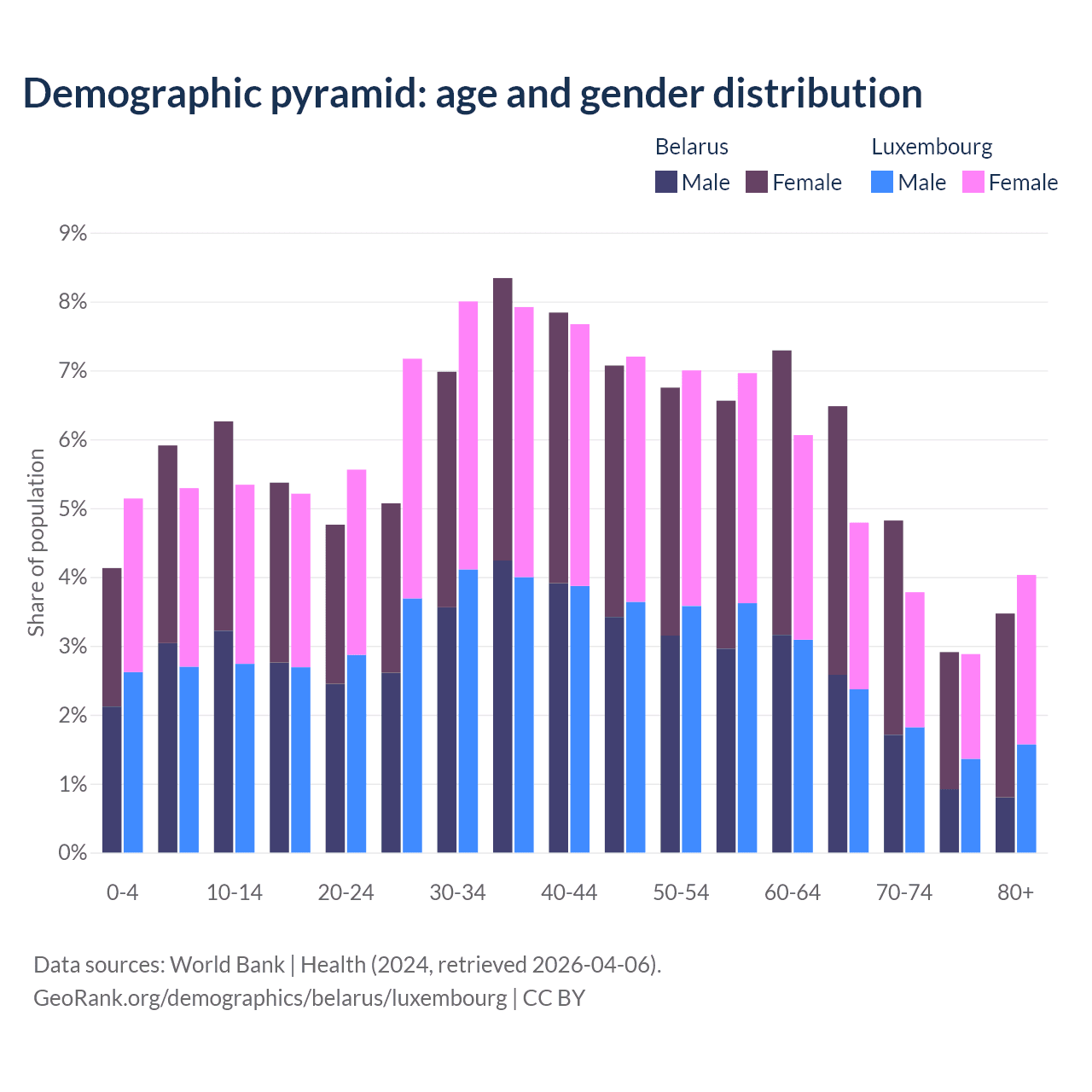 - As of 2026, the population of Belarus is 9.01M vs 694K in Luxembourg - 13 times difference.