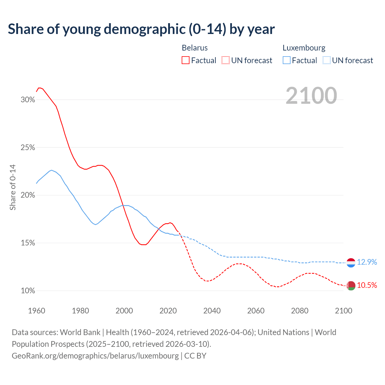 - The share of young demographic (0-15 years old) in Belarus is 16.3% vs 15.8% in Luxembourg.