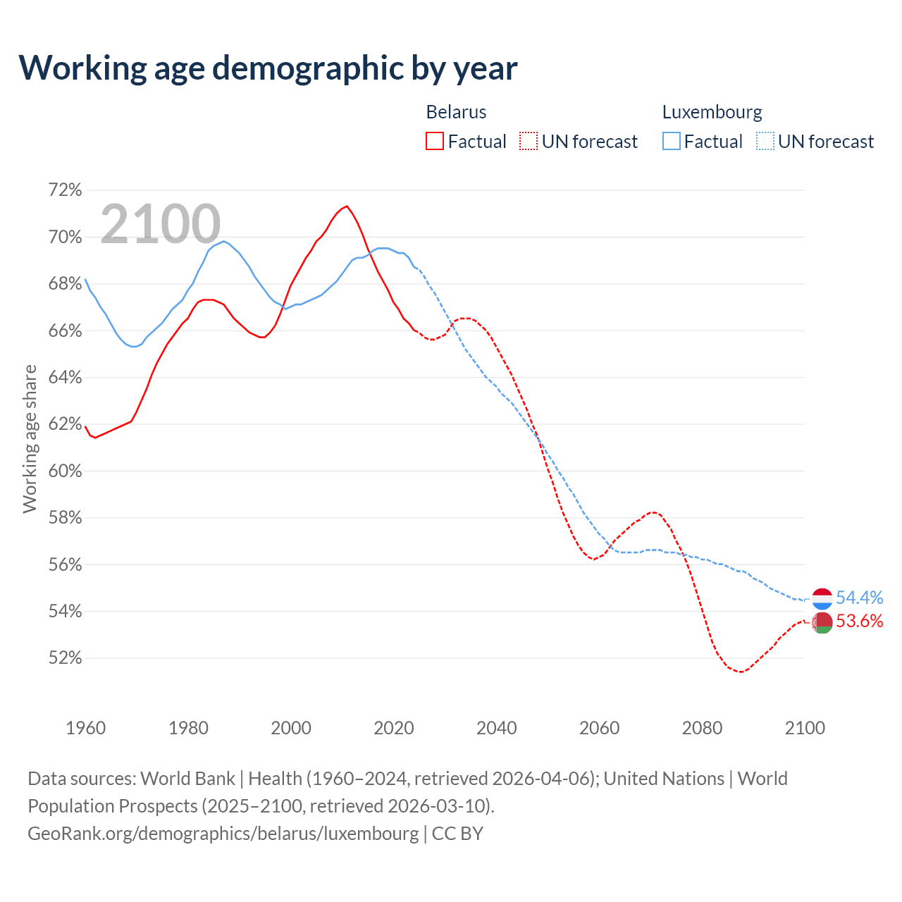 - Belarus has 5.95M working age adults (aged 15-64) vs 477K in Luxembourg.