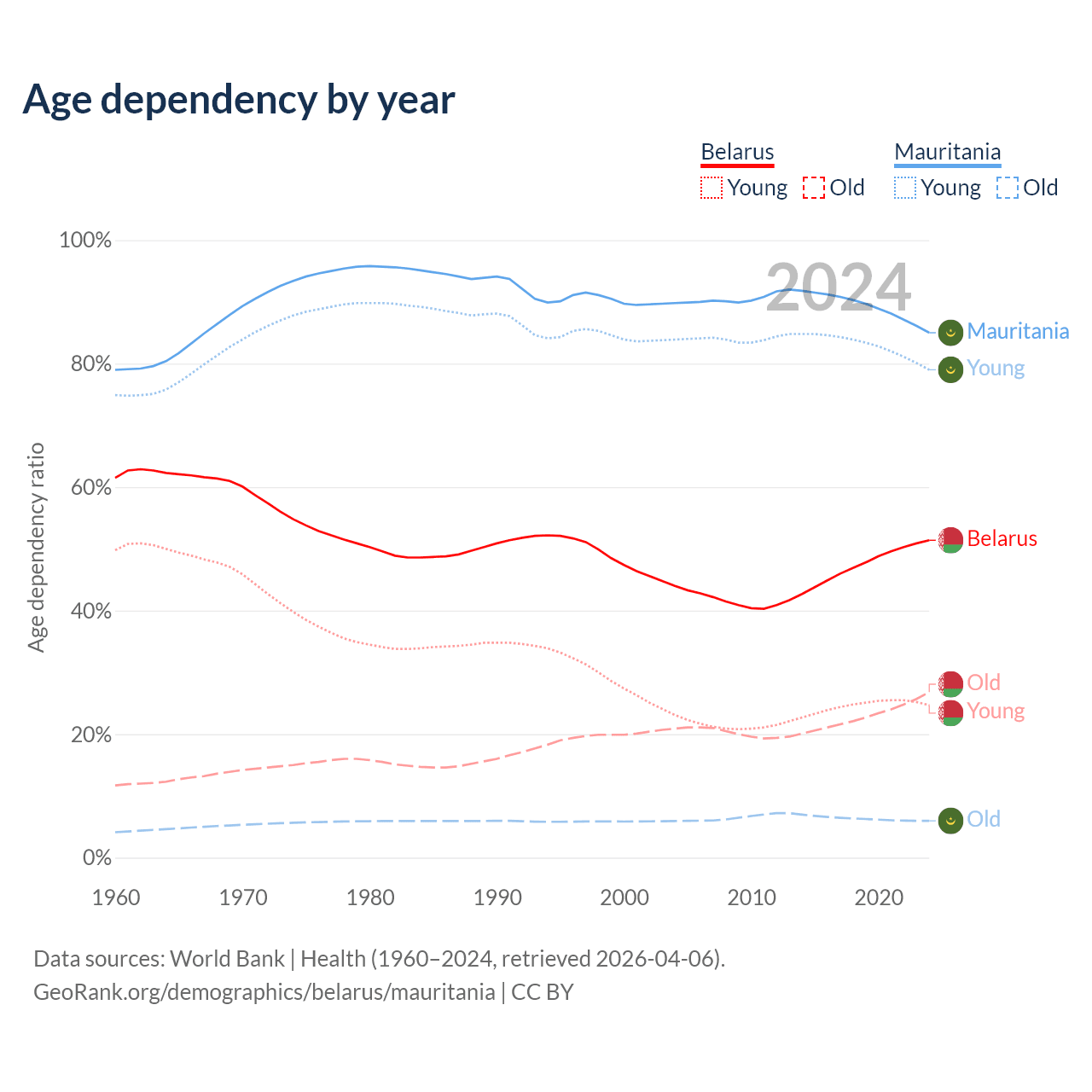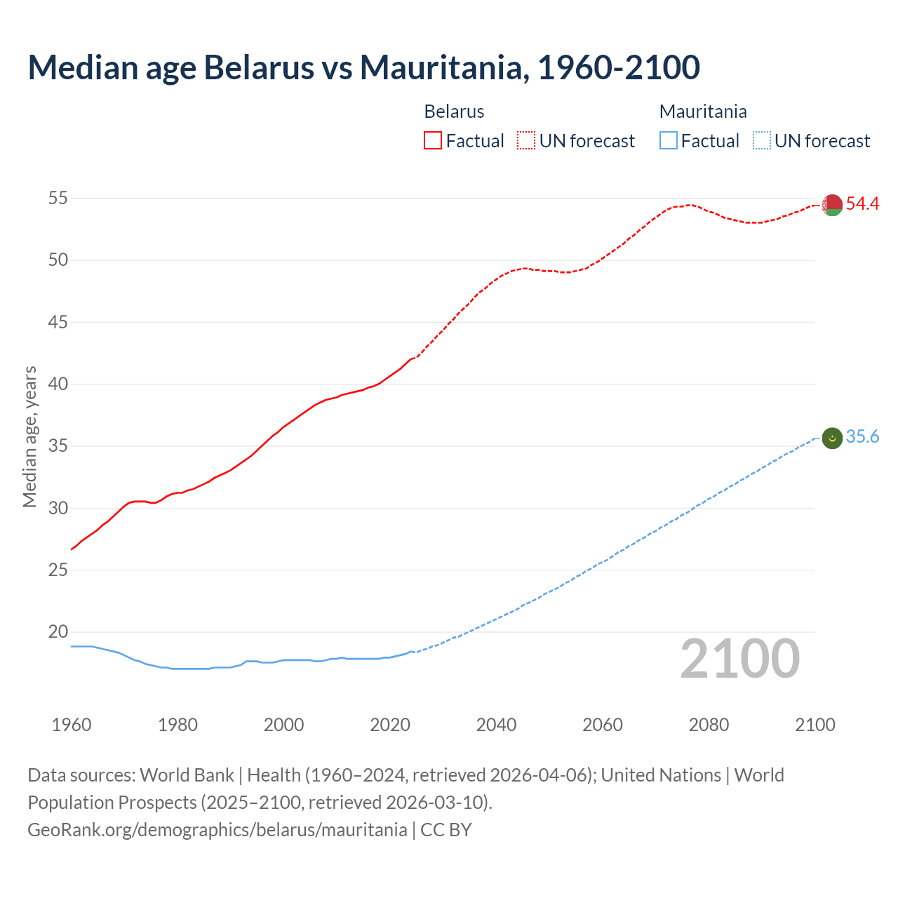 - Belarus is ranked 35/196 by median age (oldest to youngest) vs 185/196 for Mauritania.