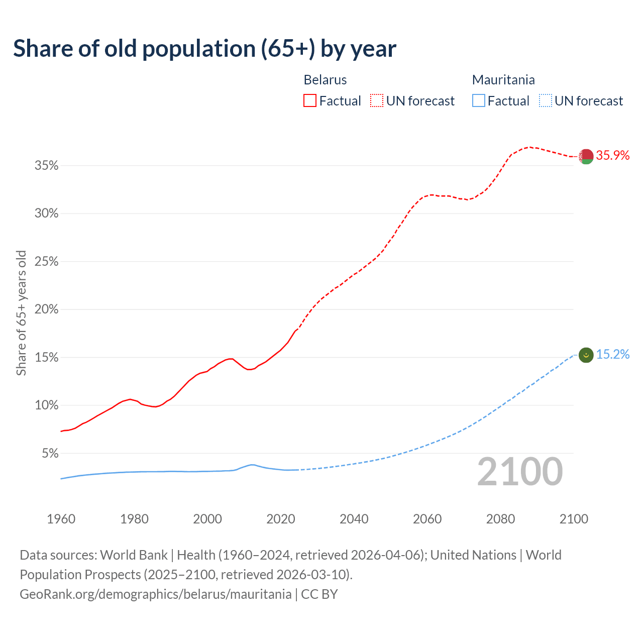 The share of older people aged 65 and over is 17.7% in Belarus and 3.23% in Mauritania. Life expectancy in Belarus compared to Mauritania .