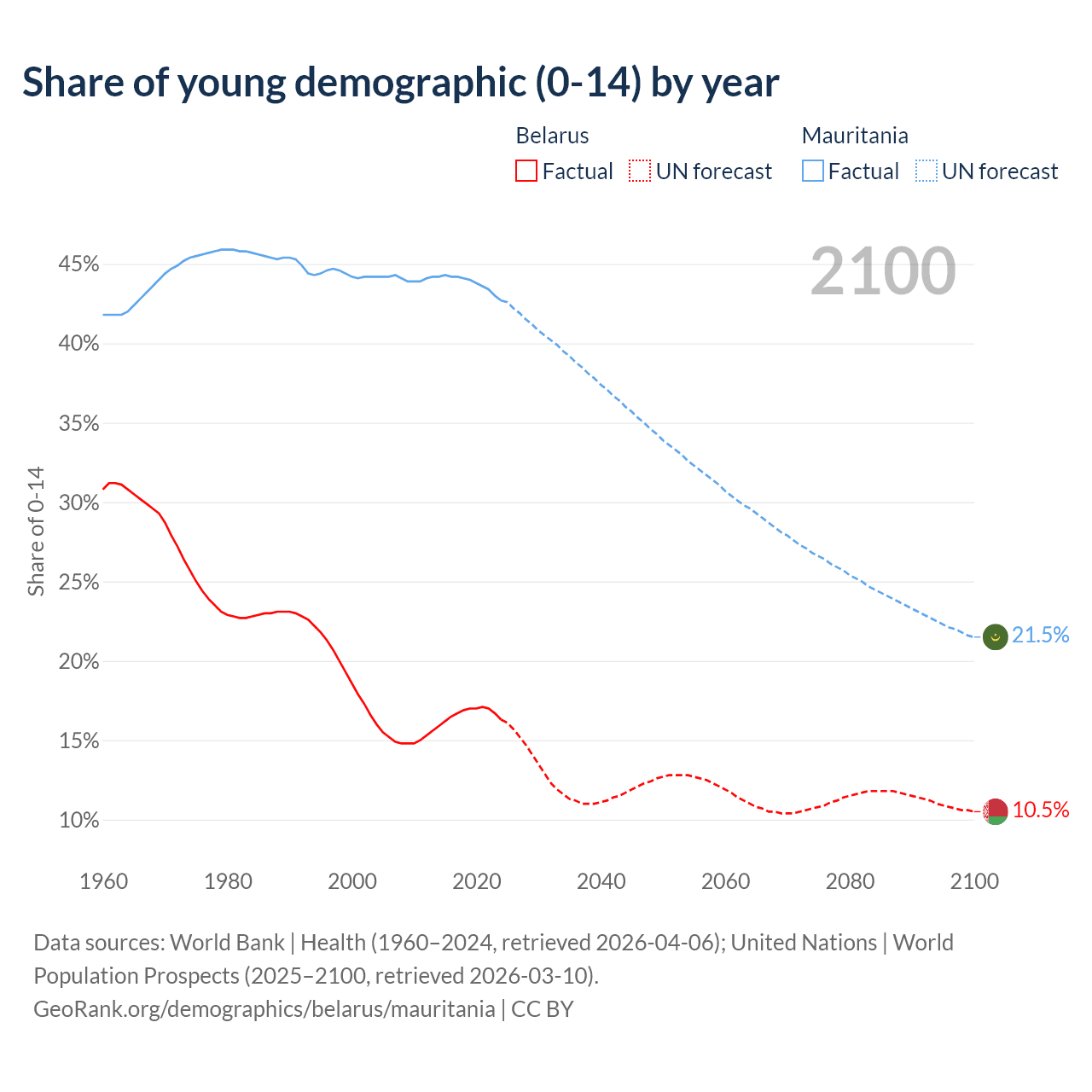 - The share of young demographic (0-15 years old) in Belarus is 16.3% vs 42.7% in Mauritania.