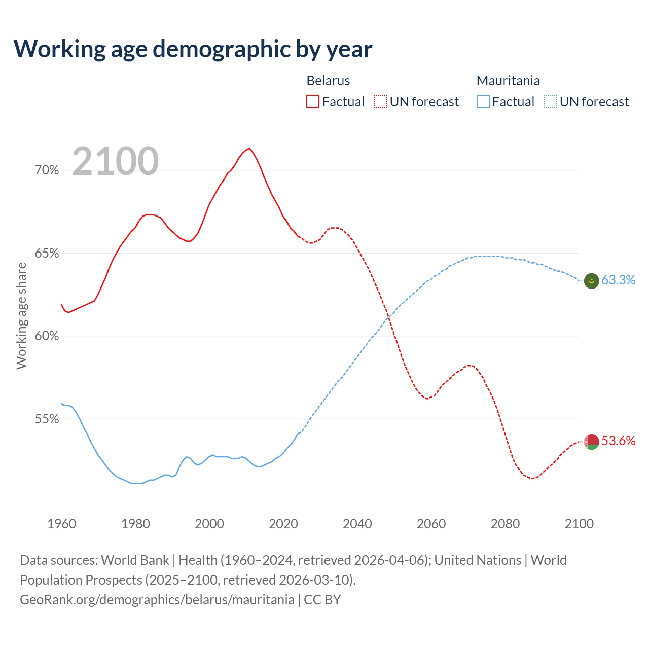 - Belarus has 5.95M working age adults (aged 15-64) vs 2.98M in Mauritania.
